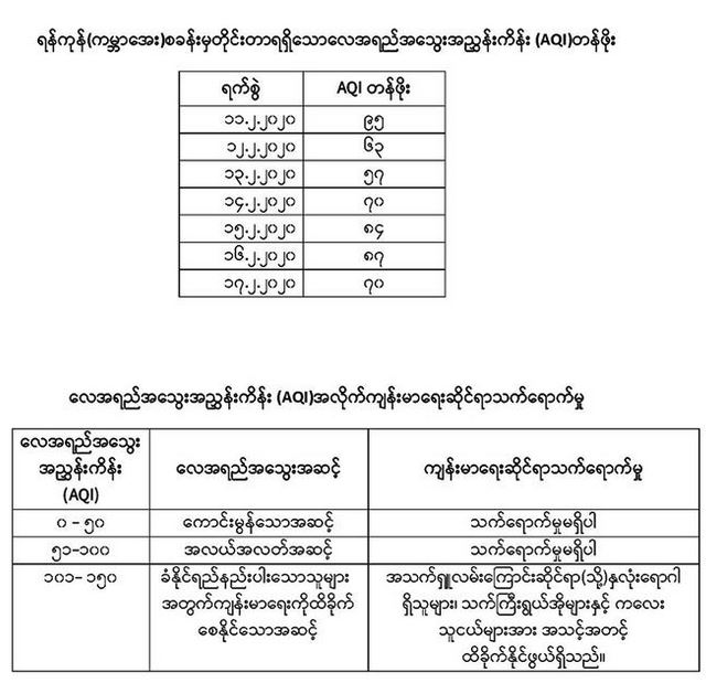(၁၁-၂-၂၀၂၀)ရက်နေ့မှ (၁၇-၂-၂၀၂၀) ရက်နေ့အထိ မိုးလေဝသနှင့်ဇလဗေဒညွန်ကြားမှုဦးစီးဌာန၊ ရန်ကုန်(ကမ္ဘာအေး) စခန်းက နေ့စဉ်တိုင်းတာရရှိသည့် လေအရည်အသွေး (PM2.5) အခြေအနေများကို ဖော်ပြထားပါသည်။