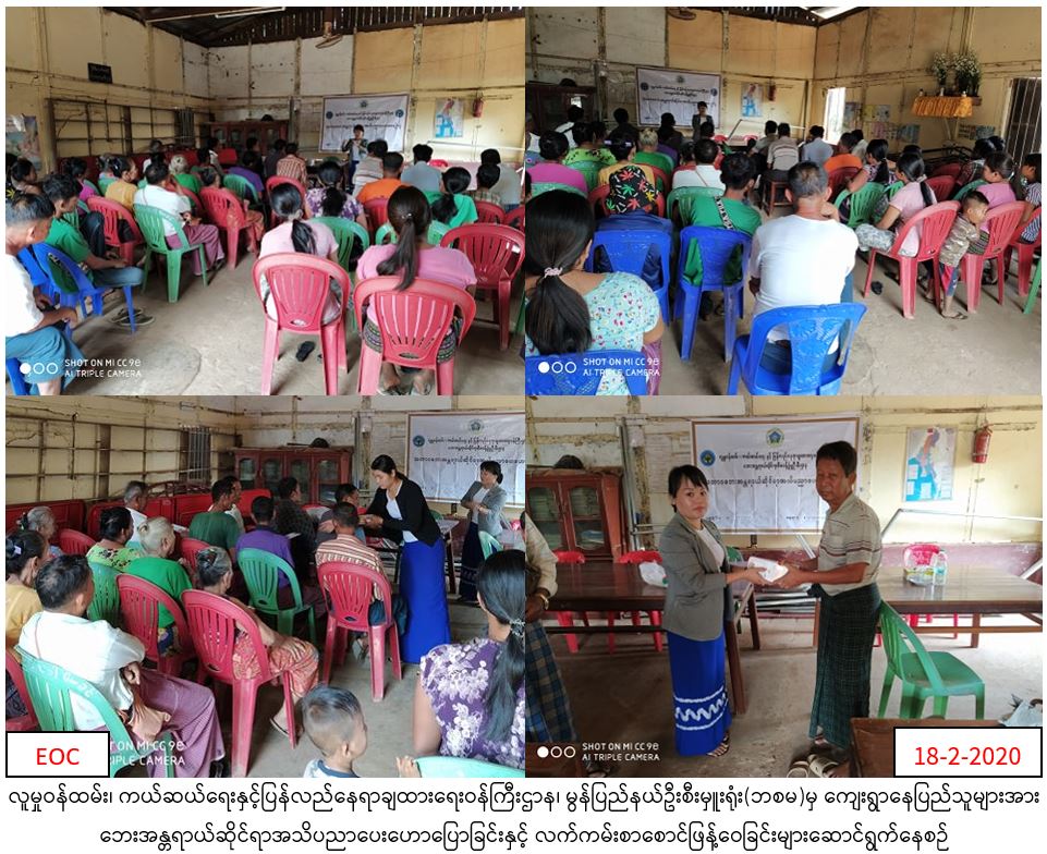 လူမှုဝန်ထမ်း၊ ကယ်ဆယ်ရေးနှင့်ပြန်လည်နေရာချထားရေးဝန်ကြီးဌာန၊ ဘေးအန္တရာယ်ဆိုင်ရာစီမံခန့်ခွဲမှုဦးစီးဌာန၊ မွန်ပြည်နယ်ဦးစီးမှူးရုံးမှတာဝန်ရှိသူများသည် မွန်ပြည်နယ်၊ မော်လမြိုင်မြို့၊ မင်းရွာကျေးရွာ စာကြည့်တိုက်၌ (၁၈-၂-၂၀၂၀)ရက်နေ့(၁၀း၃၀)နာရီအချိန်မှ(၁၁း၃၀)နာရီအချိန်အထိ ကျင်းပပြုလုပ်ခဲ့ရာ ကျေးရွာသူ/သားစုစုပေါင်း(၆၀)ဦးခန့်. တက်ရောက်ခဲ့ပြီး သဘာဝဘေးနှင့်စပ်လျဉ်း၍ ဆောင်ရန်၊ရှောင်ရန်အချက်များဆွေးနွေးခြင်း၊ လက်ကမ်းစာစောင်များဖြန့်ဝေခြင်းများဆောင်ရွက်ခဲ့ကြောင်း သတင်းရရှိပါသည်။