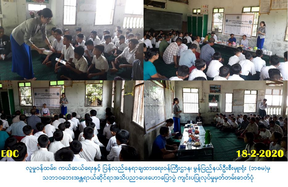 လူမှုဝန်ထမ်း၊ ကယ်ဆယ်ရေးနှင့်ပြန်လည်နေရာချထားရေးဝန်ကြီးဌာန၊ ဘေးအန္တရာယ်ဆိုင်ရာစီမံ ခန့်ခွဲမှုဦးစီးဌာန၊ မွန်ပြည်နယ်ဦးစီးမှူးရုံးမှ တာဝန်ရှိသူများသည်(၁၈-၂-၂၀၂၀)ရက်နေ့၊ နံနက် (၁၀:၃၀)နာရီမှ (၁၁:၃၀)နာရီအထိ ကျိုက်မရောမြို့နယ်၊ လက်ပန်ကျေးရွာ၊ အခြေပညာအလယ် တန်းကျောင်း၌ သဘာဝဘေးအန္တရယ်ဆိုင်ရာ အသိပညာပေးဟောပြော ဆွေးနွေးခြင်းနှင့် စပ်လျဉ်း ၍ ကြိုတင်ပြင်ဆင်ခြင်း၊ ကြိုတင်ကာကွယ်ခြင်းအား ကျောင်းသား၊ ကျောင်းသူများနှင့် ကျေးရွာနေ ပြည်သူစုစုပေါင်း(၁၀၀)ဦးဖြင့် ဟောပြောဆွေးနွေးခဲ့ပါကြောင် သတင်းရရှိပါသည်။