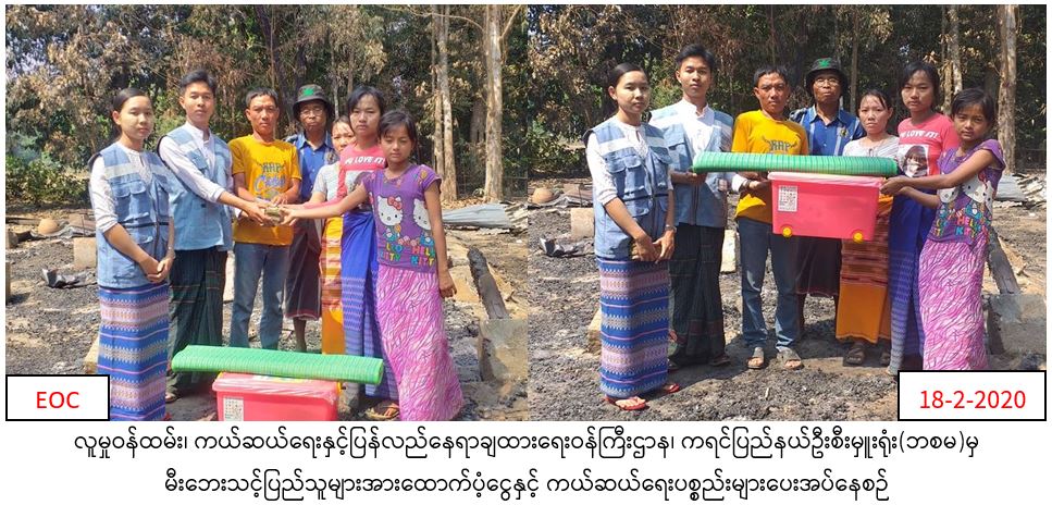 လူမှုဝန်ထမ်း၊ ကယ်ဆယ်ရေးနှင့်ပြန်လည်နေရာချထားရေးဝန်ကြီးဌာန၊ ဘေးအန္တရာယ်ဆိုင်ရာစီမံခန့်ခွဲမှုဦးစီးဌာန၊ ကရင်ပြည်နယ်ဦးစီးမှူးရုံးမှ (၁၆-၂-၂၀၂၀)ရက်နေ့ ၊ (၂၁၄၅)အချိန်၌ လှိုင်းဘွဲမြို့နယ်၊ ပိုင်ကျုံမြို့၊ ဝင်းဖရကျေးရွာအုပ်စု၊ တောင်ပလောင်ကျေးရွာအပိုင်းတွင် ပျဉ်ကာ၊ပျဉ်ခင်း ၊ သွပ်မိုးနေအိမ်(၁)လုံး မီးလောင်ကျွမ်းခဲ့ပြီး လူ(၂)ဦး သေဆုံးခဲ့ပါသည်။ အဆိုပါမီးဘေးကြောင့် သေဆုံးသူ(၂)ဦးအတွက် ထောက်ပံငွေ (၆၀၀၀၀ဝိ/-)နှင့် အိမ်ထောင်စု(၁)စု ၊ လူဦးရေ(၂)ဦးအတွက် ကယ်ဆယ်ရေးပစ္စည်း(၁၇)မျိုးပါ အိမ်ထောင်စု (၁)စုစာ၊ ဆန်ရိက္ခာ(၇)ရက်စာဖိုးငွေ(၄၂၀ဝိ/-)နှင့် အိမ်ဆောက်ပစ္စည်းဖိုးငွေ(၂၀၀၀၀ဝိ/-)၊ စုစုပေါင်း(၈၀၄၂၀ဝိ/-)အား (၁၈-၂-၂၀၂၀)ရက်နေ့၊ (၁၂း၀၀)အချိန်တွင် ထောက်ပံ့ပေးခဲ့ကြောင်း သတင်းရရှိပါသည်။
