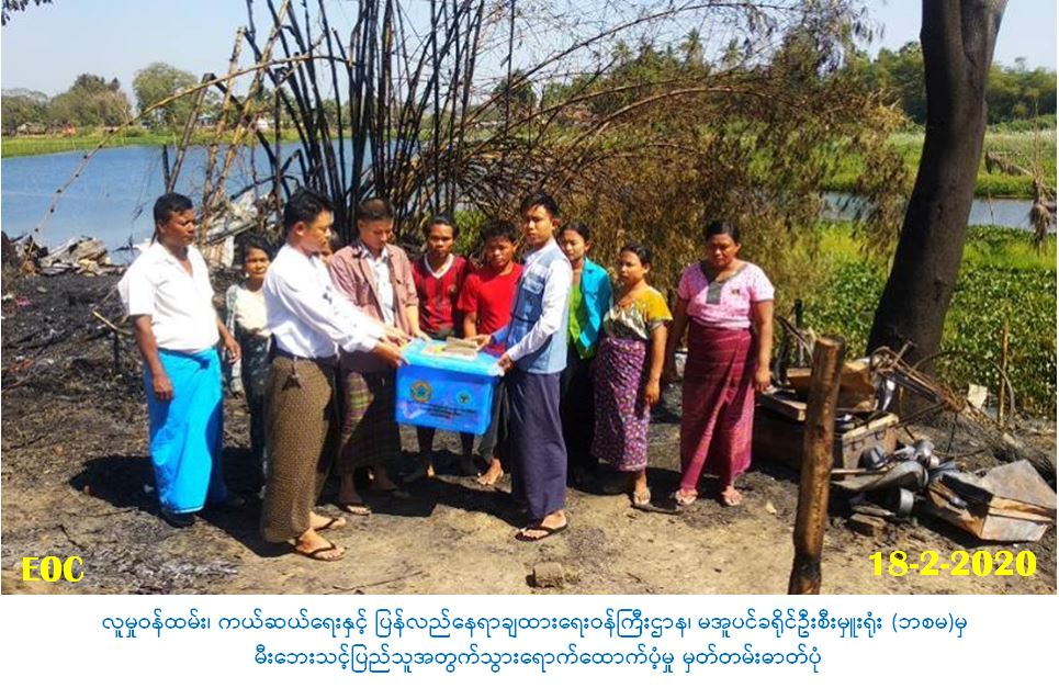 လူမှုဝန်ထမ်း၊ ကယ်ဆယ်ရေးနှင့်ပြန်လည်နေရာချထားရေးဝန်ကြီးဌာန၊ ဘေးအန္တရာယ်ဆိုင်ရာစီမံ ခန့်ခွဲမှုဦးစီးဌာန၊ မအူပင်ခရိုင်ဦးစီးမှူးရုံးမှ တာဝန်ရှိသူများသည် (၁၇-၂-၂၀၂၀) ရက်နေ့တွင် မအူပင်ခရိုင်၊ ပန်းတနော်မြို့နယ်၊ ဆပ်သေကျေးရွာအုပ်စု၊ ဘုရားကြီးဒေါင့်ကျေးရွာ၌ ဖြစ်ပွားခဲ့သော မီးဘေးကြောင့် ပျက်စီးဆုံးရှုံးခဲ့သည့် နေအိမ်(၇)လုံး၊ အိမ်ထောင်စု(၇)စုမှ လူဦးရေ(၂၅)ဦးအတွက် ကယ်ဆယ်ရေးပစ္စည်း (၁၇)မျိုးပါ (၅)ပုံး/(၁၆) မျိုးပါ (၂)ပုံး တန်ဖိုး (၂၇၆၄၇၁/-) ကျပ်၊ အိမ်ဆောက် ပစ္စည်းဖိုးထောက်ပံ့ငွေ (၇၀၀၀၀ဝ/-)ကျပ် နှင့် ဆန်ရိက္ခာဖိုးထောက်ပံ့ငွေ (၅၂၅၀ဝ/-) ကျပ်၊ စုစု ပေါင်း ကယ်ဆယ်ရေးရန်ပုံငွေ (၇၅၂၅၀ဝ/-)ကျပ်တို့အား (၁၈-၂-၂၀၂၀) ရက်နေ့၊ (၁၄:၀၀)နာရီ အချိန်တွင် ကျေးရွာအုပ်ချုပ်ရေးမှူးနှင့်အတူ ဘေးသင့်ပြည်သူများထံ သွားရောက်ထောက်ပံ့ပေး အပ်ခဲ့ပါကြောင်း သတင်းရရှိပါသည်။