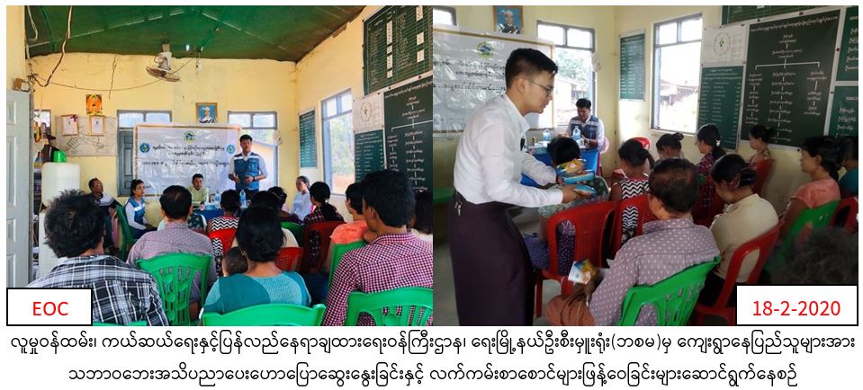 လူမှုဝန်ထမ်း၊ ကယ်ဆယ်ရေးနှင့် ပြန်လည်နေရာချထားရေးဝန်ကြီးဌာန၊ ဘေးအန္တရာယ်ဆိုင်ရာစီမံခန့်ခွဲမှုဦးစီးဌာန၊ ရေးမြို့နယ်ဦးစီးမှူးရုံးမှတာဝန်ရှိသူများသည် မွန်ပြည်နယ်၊ မော်လမြိုင်ခရိုင်၊ရေးမြို့နယ်၊ အဘေကျေးရွာအုပ်စု၌ အဘော်ကျေးရွာအုပ်ချုပ်ရေးမှူးရုံးတွင် (၁၈.၂.၂၀၂၀) ရက်နေ့၊ နံနက် (၁၀:၀၀) နာရီမှ (၁၁:၃၀)နာရီအချိန်အထိ ကျေးရွာသူ/သား (၈၀) ဦးခန့်ကို သဘာဝဘေးလျော့ပါးရေး အသိပညာပေးဟောပြောခဲ့ရာ ဟောပြောပွဲ၌ သဘာဝဘေးအန္တရာယ်နှင့် ပတ်သက်၍ ဆောင်ရန်ရှောင်ရန်များ သဘာဝဘေးအန္တရာယ်ဆိုင်ရာစီမံခန့်ခွဲမှုဥပဒေနှင့် နည်းဥပဒေဆိုင်ရာများဆွေးနွေးဟောပြောခဲ့ပြီး လက်ကမ်းစာစောင်နှင့် မုန့်များဖြန့်ဝေခဲ့ပါကြောင်း သတင်းရရှိပါသည်။