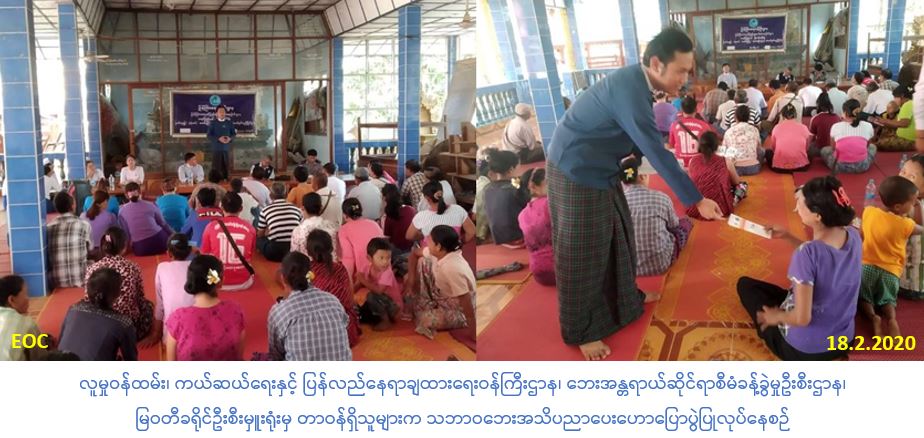 လူမှုဝန်ထမ်း၊ ကယ်ဆယ်ရေးနှင့် ပြန်လည်နေရာချထားရေးဝန်ကြီးဌာန၊ ဘေးအန္တရာယ်ဆိုင်ရာစီမံခန့်ခွဲမှုဦးစီးဌာန၊ မြဝတီခရိုင်ဦးစီးမှူးရုံးမှ တာဝန်ရှိသူများသည် (၁၈-၂-၂၀၂၀) ရက်နေ့တွင် မြဝတီမြို့၊ မဲ့ပလဲ့ကျေးရွာရှိ ပြည်သူလူထု (၁၀၀) ဦးခန့်အား သဘာဝဘေးအသိပညာပေး ဟောပြောခြင်းများဆောင်ရွက်ခဲ့ပြီး လက်ကမ်းစာစောင်နှင့် နံရံကပ်ပိုစတာများ ဖြန့်ဝေပေးခဲ့ပါကြောင်း သတင်းရရှိပါသည်။