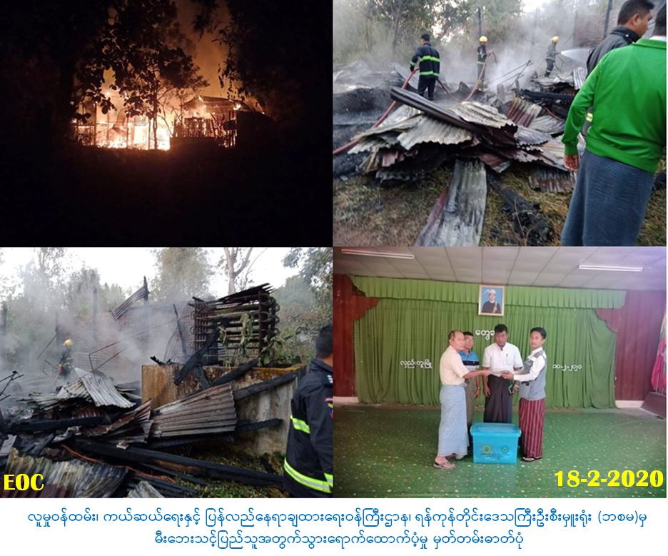 လူမှုဝန်ထမ်း၊ကယ်ဆယ်ရေးနှင့်ပြန်လည်နေရာချထားရေးဝန်ကြီးဌာန၊ဘေးအန္တရာယ်ဆိုင်ရာစီမံခန့်ခွဲမှုဦးစီးဌာန၊ရန်ကုန်တိုင်းဒေသကြီးဦးစီးမှူးရုံးမှ တာဝန်ရှိသူများသည် (၁၃-၂-၂၀၂၀)ရက်နေ့တွင် ရန်ကုန်တိုင်းဒေသကြီး၊ မြောက်ပိုင်းခရိုင်၊ လှည်းကူးမြို့နယ်၊ ငါးဆူတောင်ကျေးရွာအုပ်စု၊ အမှတ်(၄)ရပ်ကွက်၌ မီးလောင်မှုဖြစ်ပွားခဲ့ရာ နေအိမ်(၁)လုံးမီးလောင်ဆုံးရှုံးခဲ့ပြီး အိမ်ထောင်စု(၁)စု မှလူဦးရေ(၁)ဦး မီးဘေးသင့်ခဲ့ပါသဖြင့် မီးဘေးသင့်နေအိမ်(၁)လုံးအတွက် အိမ်ဆောက်ပစ္စည်းဖိုး ထောက်ပံ့ငွေ (၂,၀၀,၀၀ဝ/-)ကျပ်၊ ဆန်ရိက္ခာဖိုးထောက်ပံ့ငွေ(၂,၁၀ဝ/-)ကျပ် နှင့် ကယ်ဆယ်ရေး ပစ္စည်း(၁၆)မျိုး၊ (၁)အိမ်ထောင်စုစာတို့အား ဘေးသင့်ပြည်သူများထံသို့ အထွေထွေအုပ်ချုပ်ရေး ဦးစီးဌာနမှ တာဝန်ရှိသူများနှင့်အတူ (၁၈-၂-၂၀၂၀)ရက်နေ့တွင် သွားရောက်၍ ထောက်ပံ့ပေးခဲ့ ပါကြောင်း သတင်းရရှိပါသည်။