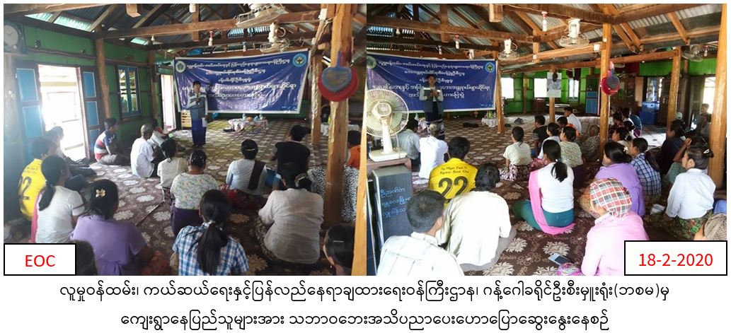 လူမှုဝန်ထမ်း၊ ကယ်ဆယ်ရေးနှင့်ပြန်လည်နေရာချထားရေးဝန်ကြီးဌာန၊ ဘေးအန္တရာယ်ဆိုင်ရာစီမံခန့်ခွဲမှုဦးစီးဌာန၊ ဂန့်ဂေါခရိုင်ဦးစီးမှူးရုံးမှ တာဝန်ရှိသူများသည် (၁၈-၂-၂၀၂၀)ရက်နေ့ (၁၃း၂၀)နာရီမှ (၁၅း၀၀)နာရီအထိ မီးသတ်ဦးစီးဌာန၊ လူမှုဝန်ထမ်းဦးစီးဌာန၊ ပြန်ကြားရေးနှင့် ပြည်သူ့ဆက်ဆံရေးဦးစီးဌာန တို့ဖြင့်ပူးပေါင်း၍ ဂန့်ဂေါခရိုင်၊ ဂန့်ဂေါမြို့နယ်၊ လုံခြုံကျေးရွာ၊ ရတနာသီရိကျောင်းတိုက်တွင် ကျေးရွာနေပြည်သူလူထု(၆၀)ဦးအား ငလျင်ဘေးနှင့် အခြား သဘာဝဘေးအန္တရာယ်ဆိုင်ရာအသိပညာပေးဟောပြောပွဲ ကျင်းပပြုလုပ်ခဲ့ပြီး၊ အသိပညာပေးလက်ကမ်းစာစောင်များအား ဖြန့်ဝေပေးခဲ့ပါကြောင်း သတင်းရရှိပါသည်။