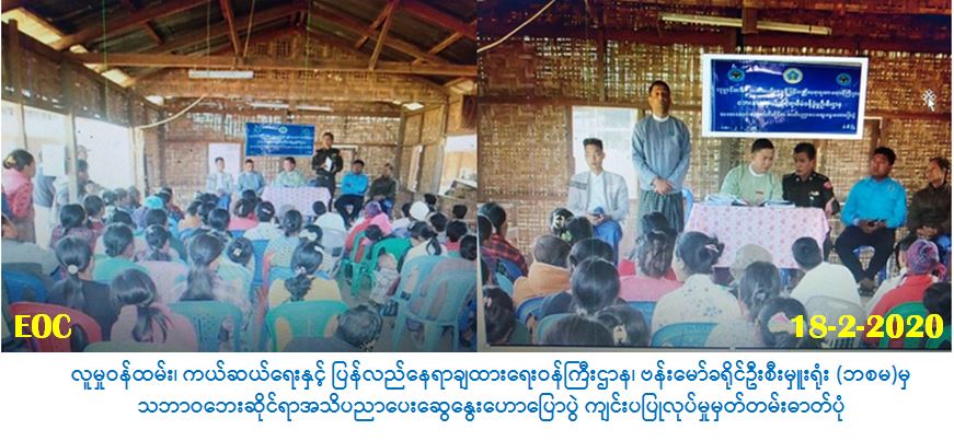 လူမှုဝန်ထမ်း၊ ကယ်ဆယ်ရေးနှင့်ပြန်လည်နေရာချထားရေးဝန်ကြီးဌာန၊ ဘေးအန္တရာယ်ဆိုင်ရာစီမံ ခန့်ခွဲမှုဦးစီးဌာန၊ ဗန်းမော်ခရိုင်ဦးစီးမှူးရုံးမှ တာဝန်ရှိသူများသည်(၁၈-၂-၂၀၂၀)ရက်နေ့၊ (၁၅:၅၀) နာရီအချိန်မှ (၁၆:၅၅) နာရီအချိန်ထိ မံစီမြို့နယ်၊ မိုင်းခေါင်ကျေးရွား၊ (RC) စစ်ရှောင်စခန်းနှင့် (KBC) စစ်ရှောင်စခန်းများတွင် ငလျင်ဘေး၊ မိုးကြိုးဘေး၊ မီးဘေး၊ မုန်တိုင်းဘေး၊ ရေဘေးနှင့် မြေပြိုဘေး ဆိုင်ရာ အသိပညာပေးဆွေနွေးဟောပြောပွဲပြုလုပ်ခဲ့ရာ မံစီမြို့နယ်၊ မိုင်းခေါင်ကျေးရွာ၊ (RC)စစ် ရှောင်စခန်းနှင့် (KBC)စစ်ရှောင်စခန်း အတွင်းနေထိုင်သူ စုစုပေါင်း (၉၀)ဦးခန့် တက်ရောက်ခဲ့ပြီး သဘာဝဘေးအန္တရာယ်နှင့်ပတ်သက်သော အသိပညာပေးလက်ကမ်းစာစောင်များ ဖြန့်ဝေပေးခဲ့ပါ ကြောင်း သတင်းရရှိပါသည်။