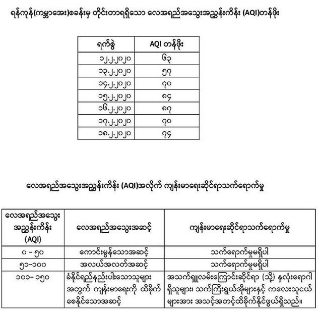 (၁၂-၂-၂၀၂၀)ရက်နေ့မှ (၁၈-၂-၂၀၂၀)ရက်နေ့အထိ မိုးလေဝသနှင့် ဇလဗေ ဒညွန်ကြားမှုဦးစီးဌာန၊ ရန်ကုန်(ကမ္ဘာအေး) စခန်းက နေ့စဉ်တိုင်းတာရရှိသည့် လေအရည်အသွေး (PM2.5) အခြေအနေများကို ဖော်ပြထားပါသည်။