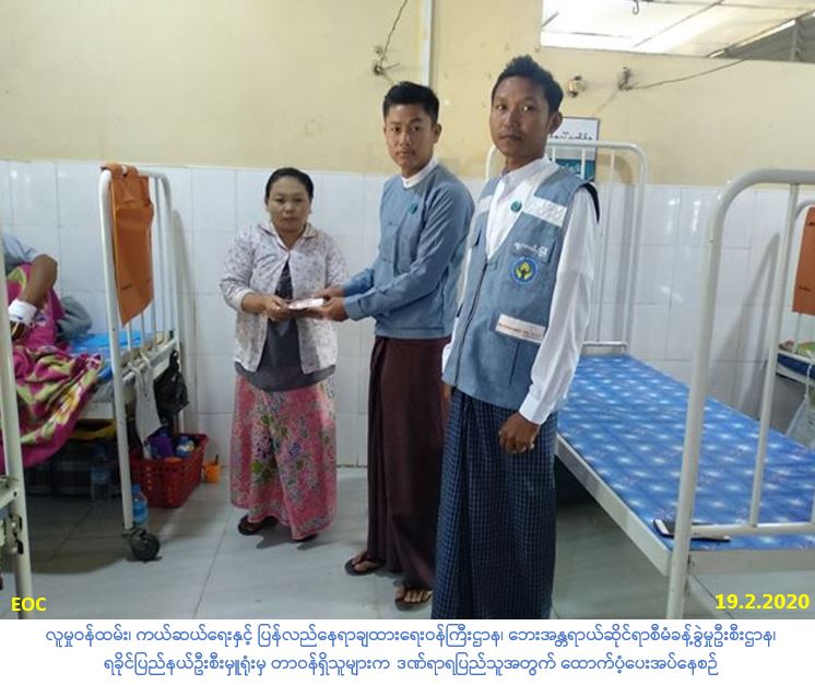 လူမှုဝန်ထမ်း၊ ကယ်ဆယ်ရေးနှင့် ပြန်လည်နေရာချထားရေးဝန်ကြီးဌာန၊ ဘေးအန္တရာယ်ဆိုင်ရာစီမံခန့်ခွဲမှုဦးစီးဌာန၊ ရခိုင်ပြည်နယ်ဦးစီးမှူရုံးမှ တာဝန်ရှိသူများသည် မင်းပြားမြို့နယ်၊ ဝါးခွပ် ချောင်းကျေးရွာမှ လက်နက်ကြီးကျည်ကျရောက်ပေါက်ကွဲမှုကြောင့် ကျည်စထိမှန်ကာ ဒဏ်ရာ ရရှိပြီး စစ်တွေပြည်သူ့ဆေးရုံကြီးသို့ ဆေးကုသရန်ရောက်ရှိလာသည့် ဒဏ်ရာရလူနာ(၁)ဦး အတွက် ထောက်ပံ့ငွေ(၅၀၀၀၀/-)ကျပ်အား (၁၉-၂-၂၀၂၀) ရက်တွင် ဆေးရုံသို့ သွားရောက် ထောက်ပံ့ပေးအပ်ခဲ့ပါကြောင်း သတင်းရရှိပါသည်။