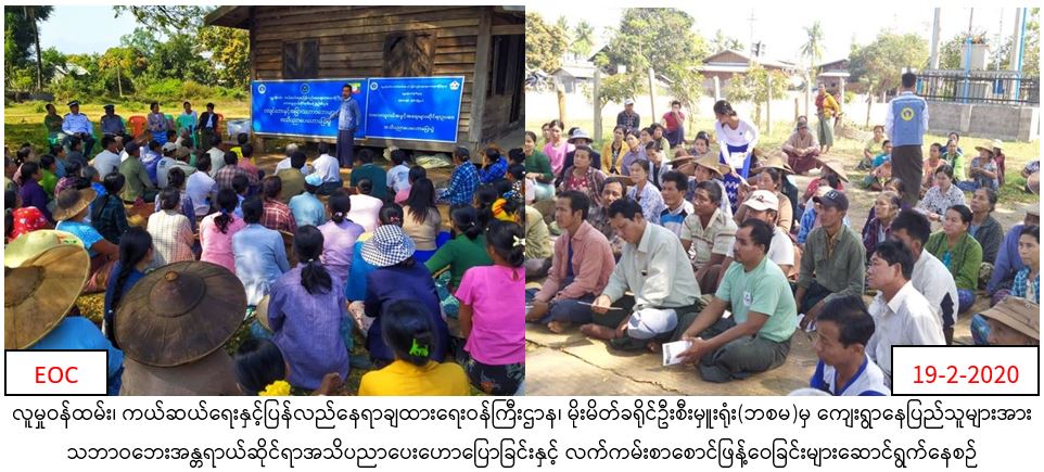 လူမှုဝန်ထမ်း၊ ကယ်ဆယ်ရေးနှင့်ပြန်လည်နေရာချထားရေးဝန်ကြီးဌာန၊ ဘေးအန္တရာယ်ဆိုင်ရာစီမံခန့်ခွဲမှုဦးစီးဌာန၊ မိုးမိတ်မြို့နယ်ဦးစီးမှူးရုံးမှ တာဝန်ရှိသူများသည် မိုးမိတ်မြို့နယ်၊ လူမှုဝန်ထမ်းဦးစီးဌာနနှင့် ပူးပေါင်း၍ (၁၉-၂-၂၀၂၀) ရက်နေ့၊ နံနက်(၁၁:၀၀)နာရီမှ (၁၂:၃၀)နာရီအထိ မိုးမိတ်မြို့နယ်၊ တောင်ကိုင်းကျေးရွာအုပ်စု၊ တောင်ကိုင်းကျေးရွာရှိ ကျေးရွာနေပြည်သူလူထုများအား ဝန်ကြီးဌာန၏ မူဝါဒများ၊ ဦးစီးဌာန၏ လုပ်ငန်းတာဝန်များ၊ ဘေးသင့်ပြည်သူများအတွက်ထောက်ပံ့မှုနှုန်းထားများ၊ ၎င်းဒေသတွင်ဖြစ်နိုင်ခြေရှိသော ငလျင်ဘေးနှင့် အခြားသောသဘာဝဘေးအန္တရာယ်များ မဖြစ်ပွားမီ၊ ဖြစ်ပွားနေစဉ်၊ ဖြစ်ပွားပြီးနောက်ပိုင်းတွင် ဆောင်ရန်၊ရှောင်ရန်များနှင့် စပ်လျဉ်း၍အသိပညာပေးဟောပြောပွဲကျင်းပခဲ့ရာ တက်ရောက်သူဦးရေ(၁၀၀)ဦးခန့်အား အသိပညာပေးလက်ကမ်းစာစောင်များဖြန့်ဝေပေးခဲ့ပါကြောင်း သတင်းရရှိပါသည်။
