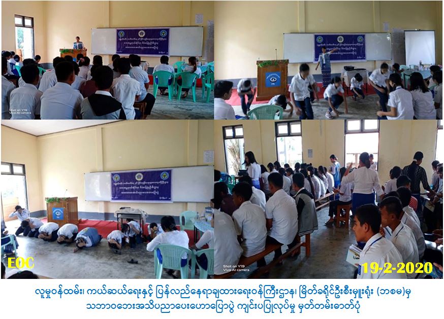 လူမှုဝန်ထမ်း၊ ကယ်ဆယ်ရေးနှင့်ပြန်လည်နေရာချထားရေး၀န်ကြီးဌာန၊ ဘေးအန္တရာယ်ဆိုင်ရာစီမံ ခန့်ခွဲမှုဦးစီးဌာန၊ မြိတ်ခရိုင်ဦးစီးမှူးရုံးမှ တာဝန်ရှိသူများသည် (၁၉-၂-၂၀၂၀)ရက်နေ့၊ နံနက် (၉:၃၀) အချိန်တွင် မြိတ်မြို့နယ်၊ အစိုရနည်းပညာအထက်တန်းကျောင်း၌ကျောင်းသားကျောင်းသူနှင့် ဆရာဆရာမနည်းပြအင်အား (၁၅၀) ဦးအား သဘာဝဘေးအသိပညာပေးဟောပြောကာ ဗီဒီယို ပြသပြီး လက်ကမ်းစာစောင်နှင့် ဗလာစာအုပ်များ ဝေငှပေးခြင်းတို့ကို ဆောင်ရွက်ခဲ့ပါကြောင်း သတင်းရရှိပါသည်။