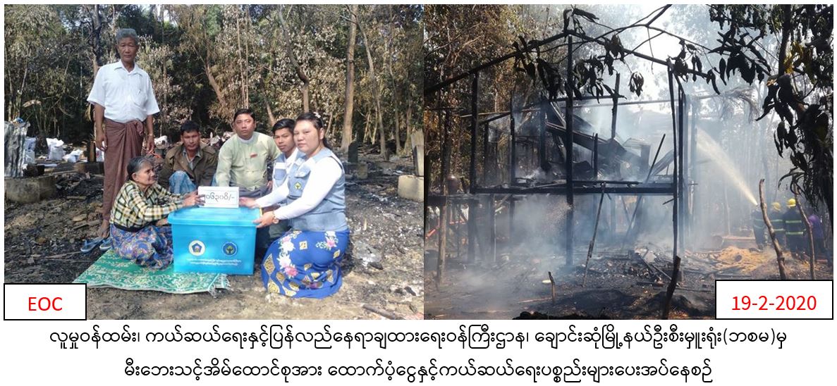လူမှုဝန်ထမ်း၊ ကယ်ဆယ်ရေးနှင့်ပြန်လည်နေရာချထားရေးဝန်ကြီးဌာန၊ ဘေးအန္တရာယ်ဆိုင်ရာစီမံခန့်ခွဲမှုဦးစီးဌာန၊ ချောင်းဆုံမြို့နယ်ဦးစီးမှူးရုံးမှ တာဝန်ရှိသူများသည် (၁၉-၂-၂၀၂၀)ရက်နေ့တွင် ချောင်းဆုံမြို့နယ်၊ တကူပတီကျေးရွာအုပ်စု၌ မီးလောင်ကျွမ်းမှုကြောင့် ပျက်စီးဆုံးရှုံးခဲ့သည့် လူနေအိမ်(၁)လုံးအတွက် အိမ်ဆောက်ပစ္စည်းဖိုးငွေ(၂၀၀၀၀ဝိ/-)၊ မီးဘေးသင့်လူဦးရေ (၃)ဦးအတွက်(၇)ရက်စာဆန်ဖိုးငွေ (၆၃၀ဝိ/-)၊စုစုပေါင်း(၂၀၆၃၀ဝိ/-)နှင့် ကယ်ဆယ်ရေးပစ္စည်း(၁၆)မျိုးတို့အား (၂၀-၂-၂၀၂၀)ရက်နေ့တွင် မြို့နယ်အထွေထွေအုပ်ချုပ်ရေးဦးစီးဌာနနှင့်ပူးပေါင်း၍ မီးဘေးသင့်ပြည်သူများလက်ဝယ်အရောက် ထောက်ပံ့ပေးအပ်ခဲ့ကြောင်း သတင်းရရှိပါသည်။