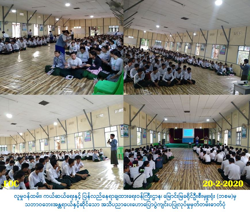 လူမှု၀န်ထမ်း၊ ကယ်ဆယ်ရေးနှင့်ပြန်လည်နေရာချထားရေး၀န်ကြီးဌာန၊ ဘေးအန္တရာယ်ဆိုင်ရာစီမံ ခန့်ခွဲမှုဦးစီးဌာန၊ မြောင်းမြခရိုင်ဦးစီးမှူးရုံးမှ တာဝန်ရှိသူများသည် (၂၀-၂-၂၀၂၀) ရက်နေ့၊ ညနေ (၁၆:၃၀)နာရီမှ (၁၇:၃၀) နာရီအချိန်အထိ မြောင်းမြမြို့နယ်၊ ပညာရေးကောလိပ်တွင် ကျောင်းသား/ ကျောင်းသူ (၄၀၀) ဦးတို့အား သဘာဝဘေးအန္တရာယ်နှင့်ဆိုင်သော အသိပညာပေးဟောပြောခြင်း များဆောင်ရွက်ခဲ့ပြီး သဘာဝဘေးအသိပညာပေးလက်ကမ်းစာစောင်များနှင့် ဗလာစာအုပ်များ ပေးအပ်ခဲ့ပါကြောင်း သတင်းရရှိပါသည်။
