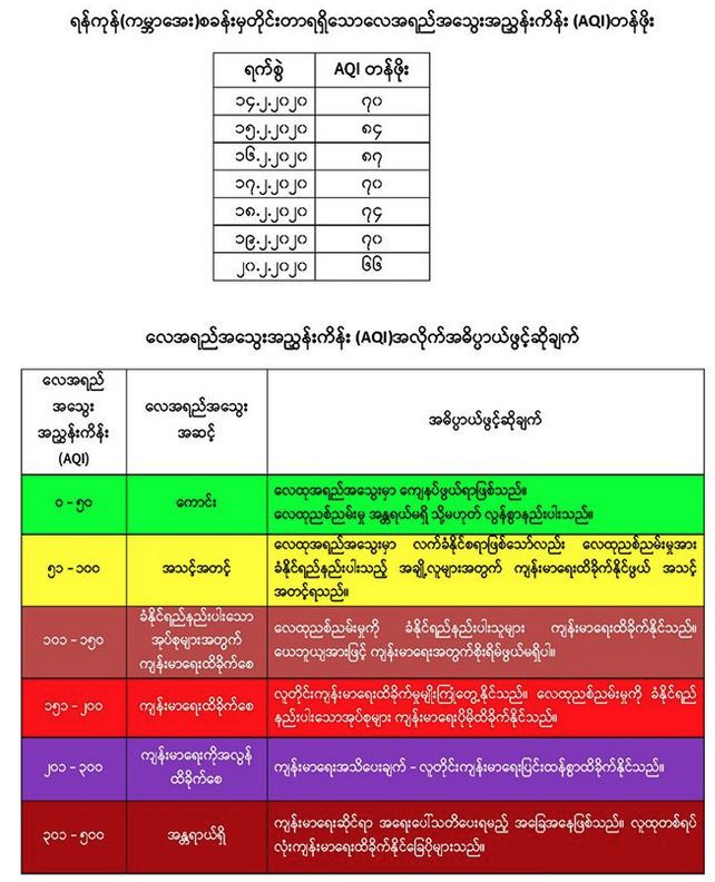 (၁၄-၂-၂၀၂၀)ရက်နေ့မှ (၂၀-၂-၂၀၂၀) ရက်နေ့အထိ မိုးလေဝသနှင့် ဇလဗေဒညွန်ကြားမှုဦးစီးဌာန၊ ရန်ကုန်(ကမ္ဘာအေး) စခန်းက နေ့စဉ်တိုင်းတာရရှိသည့် လေအရည်အသွေး (PM2.5) အခြေအနေများကို ဖော်ပြထားပါသည်။