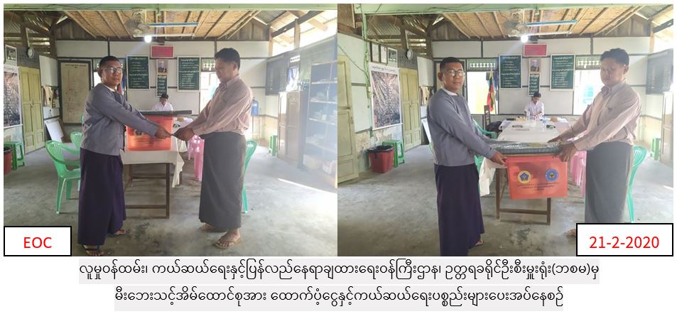 လူမှုဝန်ထမ်း၊ ကယ်ဆယ်ရေးနှင့်ပြန်လည်နေရာချထားရေးဝန်ကြီးဌာန၊ ဘေးအန္တရာယ်ဆိုင်ရာစီမံခန့်ခွဲမှုဦးစီးဌာန၊ပြည်ထောင်နယ်မြေ၊ နေပြည်တော်၊ ဇေယျာသီရိမြို့နယ်၊ ရေဆင်းကျေးရွာအုပ်စု၊ ရေဆင်းစိုက်ပျိုးရေးသုတေသနဝန်းရှိ ဝန်ထမ်းအိမ်ရာ၌ (၂၀.၂.၂၀၂၀)ရက်နေ့ (၂၀:၂၀)အချိန်တွင် ဖြစ်ပွားသော မီးဘေးကြောင့် ဘေးသင့်ခဲ့သည့်လူဦးရေ(၂)ဦးအတွက် ဆန်ရိက္ခာဖိုးရန်ပုံငွေ(၄၂၀ဝိ/-)နှင့် ကယ်ဆယ်ရေးပစ္စည်း (၁၇)မျိုး(၁)အိမ်ထောင်စုစာတို့အား ဥတ္တရခရိုင်ဦးစီးမှူးရုံးမှ တာဝန်ရှိသူများသည် (၂၁.၂.၂၀၂၀)ရက်နေ့ ( ၁၄:၃၀)အချိန်တွင် ဘေးသင့်ပြည်သူများလက်ဝယ်သို့ သွားရောက်ထောက်ပံ့ခဲ့ကြောင်း သတင်းရရှိပါသည်။