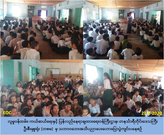လူမှုဝန်ထမ်း၊ ကယ်ဆယ်ရေးနှင့် ပြန်လည်နေရာချထားရေးဝန်ကြီးဌာန၊ ဘေးအန္တရာယ်ဆိုင်ရာ စီမံခန့်ခွဲမှုဦးစီးဌာန၊ တနင်္သာရီတိုင်းဒေသကြီးဦးစီးမှူးရုံးမှ တာဝန်ရှိသူများသည် (၂၁-၂-၂၀၂၀) ပြည့်နှစ်၊ (၁၀:၀၀) နာရီအချိန်တွင် ထားဝယ်ခရိုင်၊ ထားဝယ်မြို့နယ်၊ ရောင်းမော်ကျးရွာ၊ အ.လ.က ကျောင်း၌ ကျောင်းသား/ ကျောင်းသူ စုစုပေါင်း (၂၀၀) ဦး တို့ကို သဘာဝဘေး အသိပညာပေးဟောပြောခြင်း၊ ဘောပင်များဖြန့်ဝေခြင်းတို့ ဆောင်ရွက်ခဲ့ပါကြောင်း သိရှိရ ပါသည်။