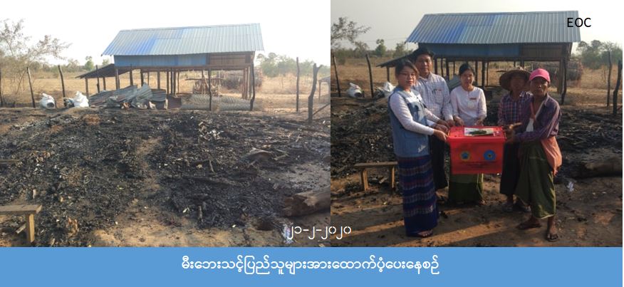 လူမှုဝန်ထမ်း၊ ကယ်ဆယ်ရေးနှင့် ပြန်လည်နေရာချထားရေးဝန်ကြီးဌာန၊ ဘေးအန္တရာယ်ဆိုင်ရာစီမံခန့်ခွဲမှုဦးစီးဌာန၊ ဆင်ပေါင်ဝဲမြို့နယ်ဉီးစီးမှူးရုံးမှတာဝန်ရှိသူများသည် မကွေးတိုင်းဒေသကြီး၊ သရက်ခရိုင်၊ ဆင်ပေါင်ဝဲမြို့နယ်၊ လယ်ကျိုးကျေးရွာအုပ်စု၊ လယ်ကျိုးကျေးရွာတွင် (၂၁-၂-၂၀၂၀) ရက်နေ့၌ ဖြစ်ပွားခဲ့သော မီးဘေးကြောင့် မီးလောင် ကျွမ်းပျက်စီးခဲ့သည် နေအိမ် (၁)လုံး၊ အိမ်ထောင်စု (၁) စုမှ လူဦးရေ (၄) ဦးအတွက် ကယ်ဆယ်ရေးပစ္စည်း (၁၆)မျိုး (၁)ပုံး အိမ်ဆောက်ပစ္စည်းဖိုး (၁၀၀,၀၀ဝ) ကျပ်၊ ဆန်ရိက္ခာ(၇)ရက်စာရန်ပုံငွေ (၈၄၀ဝ) ကျပ်၊ စုစုပေါင်းရန်ပုံငွေ (၁၀၈,၄၀ဝ) ကျပ်အား (၂၁-၂-၂၀၂၀) ရက်နေ့ (၀၄:၃၀)နာရီအချိန်တွင် ဘေးသင့်ပြည်သူများ လက်ဝယ်အရောက် ကွင်းဆင်းထောက်ပံ့ပေးအပ်ခဲ့ကြောင်း သိရှိရပါသည်။