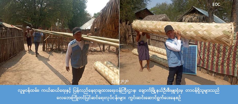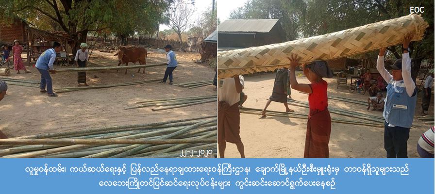 လူမှုဝန်ထမ်း၊ ကယ်ဆယ်ရေးနှင့် ပြန်လည်နေရာချထားရေးဝန်ကြီးဌာန၊ ဘေးအန္တရယ်ဆိုင်ရာ စီမံခန့်ခွဲမှု ဦးစီးဌာန၊ ချောက်မြို့နယ်ဦးစီးမှူးရုံးမှ တာဝန်ရှိသူများသည် (၂၂-၂-၂၀၂၀) ရက်နေ့၊ (၉:၃၀) နာရီမှ (၁၅:၀၀) နာရီအချိန်အထိ (၂၀၁၉-၂၀၂၀) ဘဏ္ဍာရေးနှစ်တွင် လေဘေးကြိုတင်ပြင်ဆင်ရေးလုပ်ငန်းဆောင်ရွက်မည့် နေအိမ် (၂၀၀) လုံးအနက် မကွေးတိုင်းဒေသကြီး၊ ချောက်မြို့နယ်၊ သံဘိုအုပ်စု၊ ကန်ရေလေးရွာ၊ ကန်ရေကြီးမြောက်ရွာ၊ သံဘိုကျေးရွာတို့တွင် ပြင်ဆင်ရန်လိုအပ်သည့် နေအိမ် (၂၉) လုံးအား လေဘေးကြိုတင်ကာကွယ်ရေးလုပ်ငန်း များဆောင်ရွက်ခြင်းကိုကွင်းဆင်းဆောင်ရွက်ခဲ့ကြောင်းသိရှိရပါသည်။