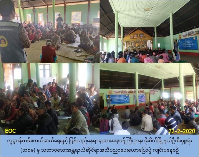လူမှုဝန်ထမ်း၊ ကယ်ဆယ်ရေးနှင့်ပြန်လည်နေရာချထားရေး၀န်ကြီးဌာန၊ ဘေးအန္တရာယ်ဆိုင်ရာ စီမံခန့်ခွဲမှုဦးစီးဌာန၊ မိုးမိတ်မြို့နယ်ဦးစီးမှူးရုံးမှ တာဝန်ရှိသူများသည် မိုးမိတ်မြို့နယ်၊ လူမှုဝန်ထမ်းဦးစီးဌာနနှင့် ပူးပေါင်း၍ (၂၁-၂-၂၀၂၀) ရက်နေ့၊ နံနက် (၁၀:၀၀) နာရီမှ (၁၂:၀၀) နာရီအထိ မိုးမိတ်မြို့နယ်၊ လယ်ဆာကျေးရွာအုပ်စု၊ လွယ်ဆာကျေးရွာရှိ ကျေးရွာနေပြည်သူ လူထုများအား ဝန်ကြီးဌာန၏မူဝါဒများ၊ ဦးစီးဌာန၏ လုပ်ငန်းတာဝန်များ၊ ဘေးသင့်ပြည်သူများ အတွက်ထောက်ပံ့မှုနှုန်းထားများ၊ ၎င်းဒေသတွင်ဖြစ်နိုင်ခြေရှိသော ငလျင်ဘေးနှင့် အခြားသော သဘာဝဘေးအန္တရာယ်များ မဖြစ်ပွားမီ၊ ဖြစ်ပွားနေစဉ်၊ ဖြစ်ပွားပြီးနောက်ပိုင်းတွင် ဆောင်ရန်/ ရှောင်ရန်များနှင့် စပ်လျဉ်း၍ အသိပညာပေးဟောပြောပွဲကျင်းပခဲ့ရာ တက်ရောက်သူဦးရေ (၁၀၀) ဦးခန့်အား အသိပညာပေးလက်ကမ်းစာစောင်များ ဖြန့်ဝေပေးခဲ့ပါကြောင်း သိရှိရ ပါသည်။