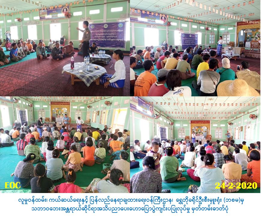 လူမှုဝန်ထမ်း၊ ကယ်ဆယ်ရေးနှင့် ပြန်လည်နေရာချထားရေးဝန်ကြီးဌာန၊ ဘေးအန္တရာယ်ဆိုင်ရာစီမံ ခန့်ခွဲမှုဦးစီးဌာန၊ ရွှေဘိုခရိုင်ဦးစီးမှူးရုံးမှ တာဝန်ရှိသူများသည် (၂၄-၂-၂၀၂၀) ရက်နေ့၊ (၁၃:၀၀) နာရီမှ (၁၄:၃၀) နာရီအချိန်ထိ ကျောက်မြောင်းမြို့၊ မလားကျေးရွာမှ ကျေးရွာသူ/ကျေးရွာသား (၁၀၀) ဦးခန့်အား သဘာဝဘေးအသိပညာပေးဆွေးနွေးဟောပြောခဲ့ပြီး သဘာဝဘေးအန္တရာယ် ဆိုင်ရာ ဆောင်ရန်/ရှောင်ရန် လက်ကမ်းစာစောင်များဖြန့်ဝေပေးခဲ့ပါကြောင်း သတင်းရရှိပါသည်။