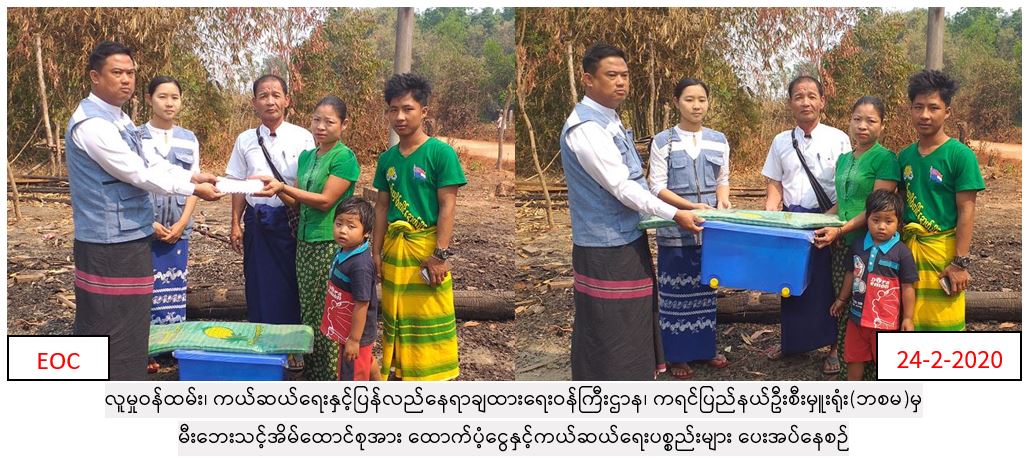 လူမှုဝန်ထမ်း၊ ကယ်ဆယ်ရေးနှင့်ပြန်လည်နေရာချထားရေးဝန်ကြီးဌာန၊ ဘေးအန္တရာယ်ဆိုင်ရာစီမံခန့်ခွဲမှုဦးစီးဌာန၊ ကရင်ပြည်နယ်ဦးစီးမှူးရုံးမှ (၉-၂-၂၀၂၀)ရက်နေ့ ၊ (၁၃း၃၀)အချိန်၌ ဘားအံမြို့နယ်၊ တောင်သူကုန်းကျေးရွာအုပ်စု၊ ခြံကလေးကျေးရွာ၊ ချမ်းသာကုန်းပိုင်းတွင် ဖက်မိုး၊ ဖက်ကာ၊ ပျဉ်ခင်းနေအိမ်(၁)လုံး မီးလောင်ကျွမ်းခဲ့ပြီး အိမ်ထောင်စု(၁)စုမှ လူဦးရေ(၃)ဉီးအတွက် ကယ်ဆယ်ရေးပစ္စည်း(၁၇)မျိုးပါ အိမ်ထောင်စု (၁)စုစာ၊ ဆန်ရိက္ခာ(၇)ရက်စာဖိုးငွေ(၆၃၀၀ိ/-)နှင့် အိမ်ဆောက်ပစ္စည်းဖိုးငွေ(၁၀၀၀၀၀ိ/-)၊ စုစုပေါင်း(၁၀၆၃၀၀ိ/-)အား (၂၄-၂-၂၀၂၀)ရက်နေ့၊ (၁၂း၃၀)အချိန်တွင် သွားရောက်ထောက်ပံ့ခဲ့ကြောင်း သတင်းရရှိပါသည်။