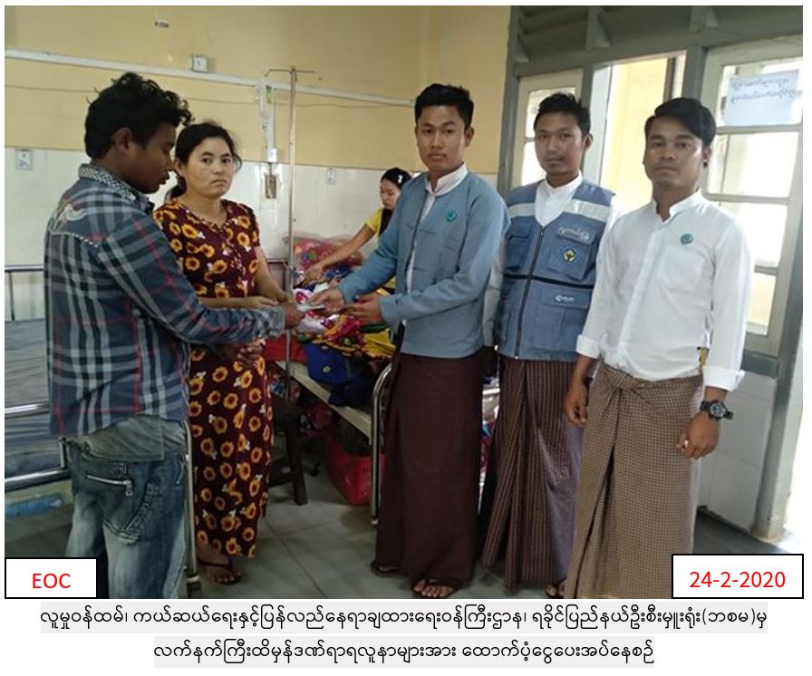 လူမှုဝန်ထမ်း၊ ကယ်ဆယ်ရေးနှင့်ပြန်လည်နေရာချထားရေးဝန်ကြီးဌာန၊ ဘေးအန္တရာယ်ဆိုင်ရာစီမံခန့်ခွဲမှုဦးစီးဌာန၊ ရခိုင်ပြည်နယ်ဦးစီးမှူးရုံးမှ ကျောက်တော်မြို့နယ်အတွင်း တိုက်ပွဲဖြစ်ပွားမှုကြောင့် ကျောက်တော်မြို့နယ်၊ ပိုက်သည်ကျေးရွာမှ လက်နက်ကြီးကျည်စထိမှန်၍ စစ်တွေပြည်သူ့ဆေးရုံကြီးသို့ ဆေးကုသရန် ရောက်ရှိလာသည့် ဒဏ်ရာရလူနာ (၂)ဦးအတွက် ဒဏ်ရာရထောက်ပံ့ငွေ(၁၀၀၀၀၀ိ/-)အား (၂၄.၂.၂၀၂၀)ရက်တွင် ဆေးရုံသို့ သွားရောက်ထောက်ပံ့ပေးအပ်ခဲ့ကြောင်း သတင်းရရှိပါသည်။
