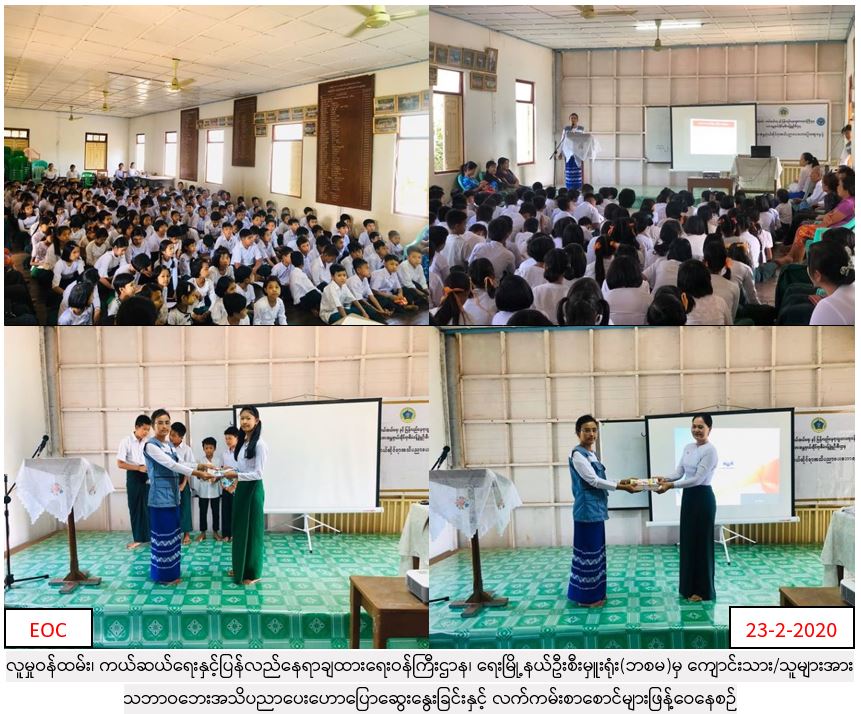 လူမှုဝန်ထမ်း၊ ကယ်ဆယ်ရေးနှင့် ပြန်လည်နေရာချထားရေးဝန်ကြီးဌာန၊ ဘေးအန္တရာယ်ဆိုင်ရာစီမံခန့်ခွဲမှုဦးစီးဌာန၊ ရေးမြို့နယ်ဦးစီးမှူးရုံးမှတာဝန်ရှိသူများသည် မွန်ပြည်နယ်၊ မော်လမြိုင်ခရိုင်၊ ရေးမြို့နယ်၊ အ.လ.က(၃) စာသင်ကျောင်း၌ (၂၅.၂.၂၀၂၀) ရက်နေ့၊ နံနက် (၁၀:၀၀) နာရီမှ (၁၁:၃၀)နာရီအချိန်အထိ ကျေးရွာသူ/သား (၂၀၀) ဦးခန့်ကို သဘာဝဘေးအန္တရာယ်နှင့်ဆိုင်သော အသိပညာပေးဟောပြောခြင်း များဆောင်ရွက်ခဲ့ပြီး သဘာဝဘေးအသိပညာပေးလက်ကမ်းစာစောင်များနှင့် ဗလာစာအုပ်များ ပေးအပ်ခဲ့ပါကြောင်း သတင်းရရှိပါသည်။