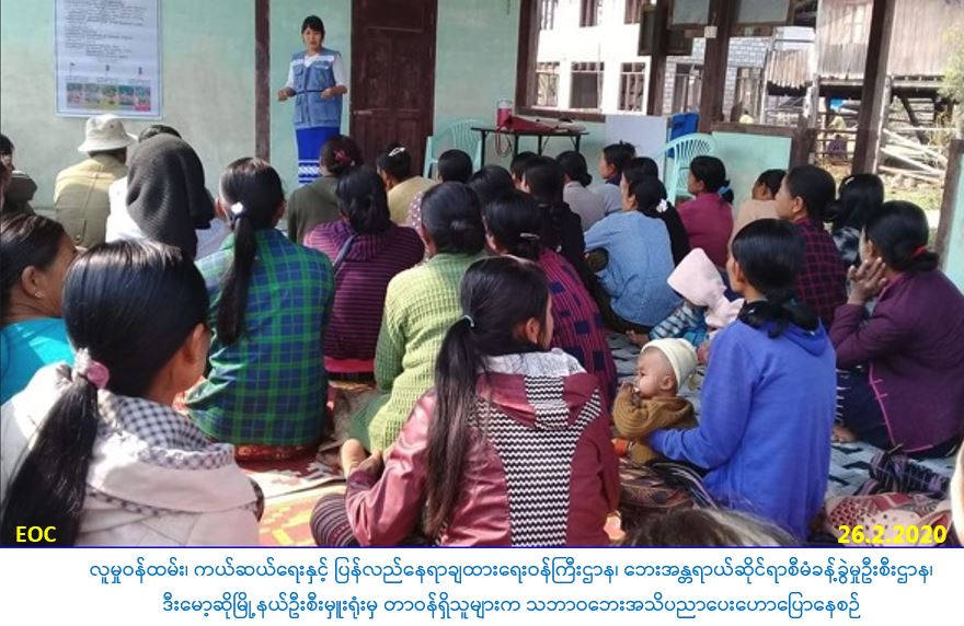 လူမှုဝန်ထမ်း၊ ကယ်ဆယ်ရေးနှင့် ပြန်လည်နေရာချထားရေးဝန်ကြီးဌာန၊ ဘေးအန္တရာယ်ဆိုင်ရာစီမံခန့်ခွဲမှုဦးစီးဌာန၊ ဒီးမော့ဆိုမြို့နယ်ဦးစီးမှူးရုံးမှ တာဝန်ရှိသူများသည် (၂၆-၂-၂၀၂၀) ရက်နေ့ (၀၉:၂၀) နာရီမှ (၁၀:၅၀) နာရီအထိ ဒီးမော့ဆိုမြို့နယ်၊ ဆောင်ဒူကျေးရွာအုပ်စု၊ ဝီသဲကူးကျေးရွာရှိ ရပ်ရွာပြည်သူ(၇၀)ဦးအား သဘာဝဘေးအန္တရာယ်ဆိုင်ရာအသိပညာပေး ဟောပြောခြင်းများဆောင်ရွက်ခဲ့ပြီး တက်ရောက်လာသူများကို လက်ကမ်းစာစောင်များဝေငှခဲ့ပါကြောင်း သတင်းရရှိပါသည်။