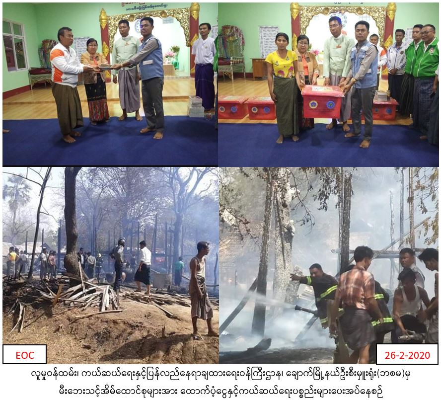 လူမှုဝန်ထမ်း၊ ကယ်ဆယ်ရေးနှင့်ပြန်လည်နေရာချထားရေးဝန်ကြီးဌာန၊ ဘေးအန္တရာယ်ဆိုင်ရာစီမံခန့်ခွဲမှုဦးစီးဌာန၊ ချောက်မြို့နယ်ဦးစီးမှူးရုံးမှ တာဝန်ရှိသူများသည် မကွေးတိုင်းဒေသကြီး၊ ချောက်မြို့နယ်၊ သံဘိုအုပ်စု၊ ကန်ရေလေးရွာတွင် (၂၆.၂.၂၀၂၀)ရက်နေ့က လောင်ကျွမ်းခဲ့သော မီးဘေးသင့်အိမ်ခြေ(၇)လုံးအတွက် အိမ်ဆောက်ပစ္စည်းရန်ပုံငွေ (၇၀၀၀၀ဝိ/-) ဘေးသင့်လူဦးရေ(၃၆) ဦးအတွက် ဆန်ရိက္ခာ (၇) ရက်စာ ရန်ပုံငွေ( ၇၅၆၀ဝိ/-)၊ စုစုပေါင်းကယ်ဆယ်ရေးရန်ပုံငွေ(၇၇၅၆၀ဝိ/-)နှင့် အိမ်ထောင်စု(၇)စုစာအတွက် ကယ်ဆယ်ရေးပစ္စည်း(၁၆)မျိုးစီတို့ကို အထွေထွေအုပ်ချုပ်ရေးဦးစီးဌာနမှ မြို့နယ်အုပ်ချုပ်ရေးမှူးနှင့်အတူ မီးဘေးသင့် ပြည်သူများလက်ဝယ်သို့အရောက် (၂၆-၂-၂၀၂၀) ရက်နေ့ညနေ(၁ရး၃၀)နာရီချိန်တွင် ထောက်ပံ့ပေးအပ်ခဲ့ကြောင်း သတင်းရရှိပါသည်။