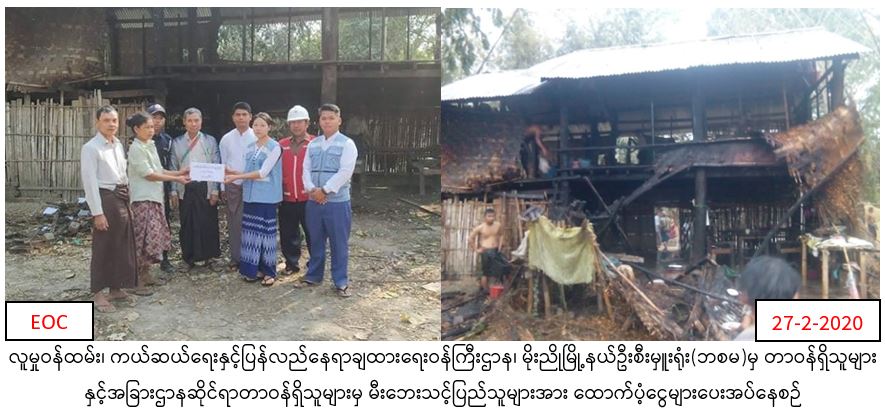 လူမှုဝန်ထမ်း၊ ကယ်ဆယ်ရေးနှင့်ပြန်လည်နေရာချထားရေးဝန်ကြီးဌာန၊ ဘေးအန္တရာယ်ဆိုင်ရာစီမံခန့်ခွဲမှုဦးစီးဌာန၊ မိုးညိုမြို့နယ်ဦးစီးမှူးရုံးမှ တာဝန်ရှိသူများသည် (၂၆-၂-၂၀၂၀)ရက်နေ့၌ ပဲခူးတိုင်းဒေသကြီး၊ သာယာဝတီခရိုင်၊ မိုးညိုမြို့နယ်၊ တက်ဆွဲကျေးရွာအုပ်စု၊ ကြို့ပင်ဝိုင်းကျေးရွာတွင် ဖြစ်ပွားခဲ့သော မီးဘေးမှ မီးဘေးသင့်တစ်စိတ်တစ်ပိုင်းပျက်စီးနေအိမ်(၁)လုံးအတွက် အိမ်ဆောက်ပစ္စည်းဖိုးထောက်ပံ့ငွေ (၃၀၀၀၀ိ/-)ကျပ်၊ အိမ်ထောင်စု(၁)စုရှိ လူဦးရေ(၂)ဦးတို့အတွက် ဆန်ရိက္ခာဖိုးထောက်ပံငွေ (၄၂၀၀ိ/-)ကျပ် စုစုပေါင်းထောက်ပံ့ငွေ (၃၄၂၀၀ိ/-)ကျပ်အား (၂၇-၂-၂၀၂၀)ရက်နေ့ (၀၉း၃ဝ)နာရီအချိန်တွင် မီးဘေးသင့်နေအိမ်၌ မြို့နယ်ပြန်ဆက်ရုံးမှ တာဝန်ရှိသူများ၊ မြို့နယ်မီးသတ်တပ်ဖွဲ့ဝင်များ၊ မြို့နယ်ကြက်ခြေနီတပ်ဖွဲ့ဝင်များ၊ ကျေးရွာအုပ်ချုပ်ရေးမှူးနှင့်အတူ ပြည်သူလက်ဝယ်အရောက် သွားရောက်ထောက်ပံ့ပေးအပ်ခဲ့ပါကြောင်း သတင်းရရှိပါသည်။