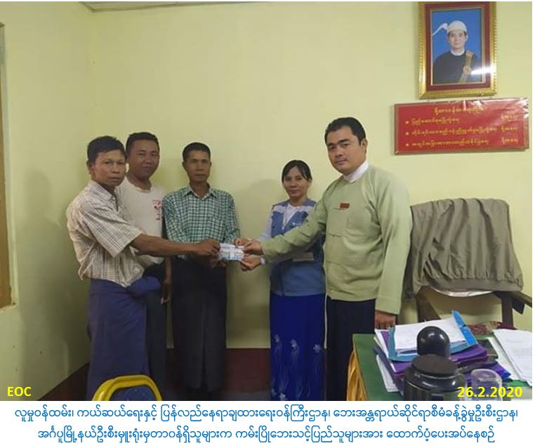 လူမှုဝန်ထမ်း၊ ကယ်ဆယ်ရေးနှင့် ပြန်လည်နေရာချထားရေးဝန်ကြီးဌာန၊ ဘေးအန္တရာယ်ဆိုင်ရာစီမံခန့်ခွဲမှုဦးစီးဌာန၊ အင်္ဂပူမြို့နယ်ဦးစီးမှူးရုံးမှတာ၀န်ရှိသူများသည် အင်္ဂပူမြို့နယ်၊ ကံဘက်ကျေးရွာအုပ်စု၊ သာယာကုန်းကျေးရွာနှင့် ရှမ်းစုကျေးရွာ၊ စစ်ကုန်းကျေးရွာအုပ်စု သဒ္ဓမ္မကျွန်းကျေးရွာတို့တွင် (၂၅-၂-၂၀၂၀) ရက်နေ့၌ ကမ်းပြိုဘေးဖြစ်ပွားမှုကြောင်း ဘေးသင့်အိမ်ခြေ(၃)လုံး၊ ၄င်းအိမ်ထောင်စု(၃)စုရှိ လူဦးရေ(၁၃)ဦးတို့အတွက် အိမ်ဆောက်ပစ္စည်းဖိုးထောက်ပံ့ငွေ(၃၀၀၀၀၀/-)ကျပ်၊ ဆန်ရိက္ခာဖိုးထောက်ပံ့ငွေ (၂၇၃၀၀/-)ကျပ် စုစုပေါင်း ထောက်ပံ့ငွေ(၃၂၇၃၀၀/-)ကျပ်အား (၂၆-၂-၂၀၂၀) ရက်နေ့ (၁၅:၀၀) အချိန်၌ အင်္ဂပူမြို့နယ်အထွေထွေအုပ်ချုပ် ရေးဦးစီးဌာနမှ တာဝန်ရှိသူများနှင့်အတူ ဘေးသင့်ပြည်သူများလက်၀ယ်သို့ ထောက်ပံ့ပေးအပ်ခဲ့ပါကြောင်း သတင်းရရှိပါသည်။