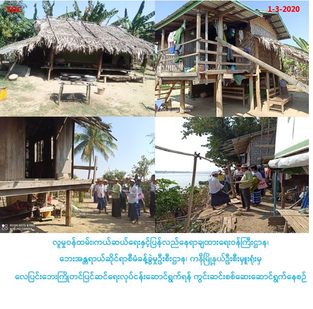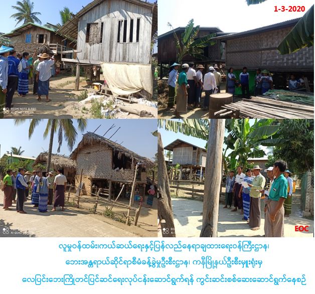 လူမှု၀န်ထမ်း၊ ကယ်ဆယ်ရေးနှင့်ပြန်လည်နေရာချထားရေး၀န်ကြီးဌာန၊ ဘေးအန္တရာယ်ဆိုင်ရာစီမံခန့်ခွဲမှုဦးစီးဌာန၊ ကနီမြို့နယ်ဦးစီးမှူးရုံးမှ တာဝန်ရှိသူ များသည် (၁-၃-၂၀၂၀) ရက်နေ့ (၁၀:၀၀)နာရီအချိန်မှ (၁၂:၀၀)နာရီအချိန်ထိ ကနီမြို့နယ်မဲဒင်ကျေးရွာအုပ်စု၊ မဲဒင်(မ)ကျေးရွာ၌ ဒုတိယမြို့နယ်အုပ်ချုပ်ရေးမှူး၊ မြို့နယ်မီးသတ်ဦးစီးဌာန၊ လူမှုရေးအသင်းအဖွဲ့များ ကျေးရွာအုပ်ချုပ်ရေးမှူး၊ ကျေးရွာခွဲတာဝန်ခံ၊ ရာအိမ်မှူး၊ ဆယ်အိမ်မှူးများ ရပ်မိရပ်ဖများသည် လေပြင်းဘေးကြိုတင်ကာကွယ်ရေးပြုလုပ်ရန်လိုအပ်မည့် နေအိမ်(၄၉)လုံးအား ကွင်းဆင်းကြည့်ရှုစစ်ဆေးခြင်းလုပ်ငန်းများ ဆောင်ရွက်ခဲ့ပါကြောင်း သတင်းရရှိပါသည်။