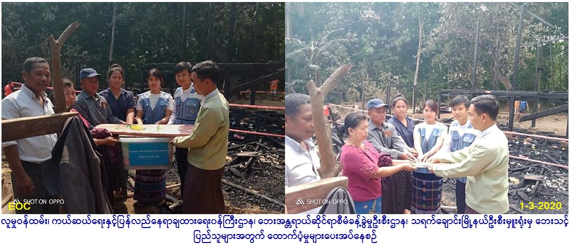 လူမှုဝန်ထမ်း၊ ကယ်ဆယ်ရေးနှင့် ပြန်လည်နေရာချထားရေး၀န်ကြီးဌာန၊ ဘေးအန္တရာယ်ဆိုင်ရာစီမံခန့်ခွဲမှုဦးစီးဌာန၊ သရက်ချောင်းမြို့နယ်ဦးစီးမှူးရုံးမှ တာဝန်ရှိသူများသည် (၂၉.၂.၂၀၂၀) ရက်နေ့ (၂၀:၄ဝ) နာရီအချိန်၌ ဖြစ်ပွားခဲ့သော သရက်ချောင်းမြို့နယ်၊ ကင်းရှေ့ကျေးရွာအုပ်စု၊ ကင်းရှေ့ကျေးရွာတွင် မီးဘေးသင့်(လုံးဝပျက်စီး) နေအိမ်(၁)အိမ်အတွက် ကယ်ဆယ်ရေးပစ္စည်း၁၇မျိုး (၁)စုစာ၊ အိမ်ဆောက်ပစ္စည်းဖိုး (၂) သိန်းနှင့် လူဦးရေ (၇) ဦးအတွက် ဆန်ရိက္ခာဖိုး (၁၄၂၀၀/-)၊ စုစုပေါင်း (၂၁၄၂၀ဝ/-) ကျပ်တို့ကို ထွေ/အုပ်တို့နှင့်အတူ (၁.၃.၂၀၂၀) ရက် (၁၃:၃၀)နာရီအချိန်တွင် သွားရောက်ထောက်ပံ့ ပေးအပ်ခဲ့ပါကြောင်း သတင်းရရှိပါသည်။