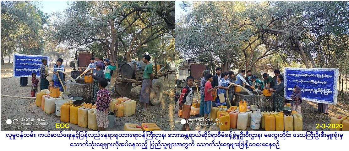 လူမှုဝန်ထမ်း၊ ကယ်ဆယ်ရေးနှင့်ပြန်လည်နေရာချထားရေး၀န်ကြီးဌာန၊ ဘေးအန္တရာယ်ဆိုင်ရာစီမံခန့်ခွဲမှုဦးစီးဌာန၊ မကွေးတိုင်း ဒေသကြီးဦးစီးမှူးရုံးမှ တာဝန်ရှိသူများသည် သောက်သုံးရေခက်ခဲသော မကွေးမြို့နယ်၊ ကြာကန်ကျေးရွာအုပ်စု၊ ကြာကန် ကျေးရွာ (အရှေ့ပိုင်း) ဗိုလ်တဲ(တဲတိုက်)နှင့် ဦးဝိုင်းမောင်(တဲတိုက်)ရှိ အိမ်ခြေ (၁၂၈) လုံး၊ အိမ်ထောင် စု (၁၃၇) စု၊ လူဦးရေ (၆၄၀) ဦးတို့အတွက် သောက်သုံးရေဂါလံ (၆၀၀၀) အား (၂- ၃-၂၀၂၀) ရက်နေ့ (၁၁ : ၃၀) နာရီအချိန်တွင် သွားရောက်ဖြန့်ဝေ ပေးခဲ့ပါကြောင်း သတင်းရရှိပါသည်။