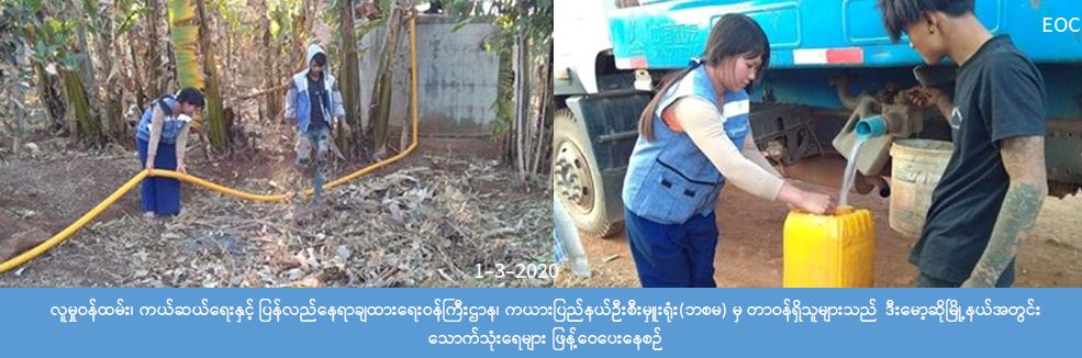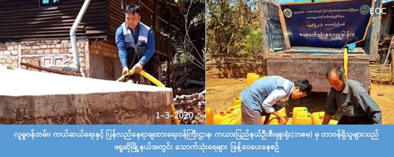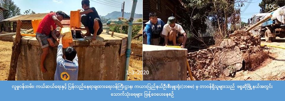 လူမှုဝန်ထမ်း၊ ကယ်ဆယ်ရေးနှင့် ပြန်လည်နေရာချထားရေးဝန်ကြီးဌာန၊ ဘေးအန္တရာယ်ဆိုင်ရာ စီမံခန့်ခွဲမှု ဦးစီးဌာန၊ ကယားပြည်နယ်ဦးစီးမှူးရုံးမှ တာဝန်ရှိသူများသည် (၁-၃-၂၀၂၀) ရက်နေ့တွင် ဒီးမော့ဆိုမြို့နယ်၊ ဆင်တောင်ကျေးရွာအုပ်စု၊ လီဝိုးကျေးရွာသို့ ရေသယ်ယာဉ် (၁) စီးဖြင့် သောက်သုံးရေ ဂါလံ(၃၂၀၀) ကို လည်းကောင်း၊ ဖရူဆိုမြို့နယ်၊ ဒိုးပရယ်ကျေးရွာအုပ်စု၊ ဒိုးပရယ်ကျေးရွာသို့ ရေသယ်ယာဉ် (၁) စီးဖြင့် သောက်သုံးရေ ဂါလံ (၃၂၀၀) ကိုလည်းကောင်း၊ ဖရူဆိုမြို့နယ်၊ ဒိုးပရယ်ကျေးရွာအုပ်စု၊ ဝှယ်သူတော်ကျးရွာသို့ ရေသယ် ယာဉ်(၁)စီးဖြင့် သောက်သုံးရေ ဂါလံ (၁၂၀၀) တို့ကို သွားရောက်ဖြန့်ဝေပေးခဲ့ကြောင်း သိရှိရပါသည်။