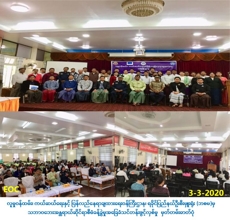 လူမှုဝန်ထမ်း၊ ကယ်ဆယ်ရေးနှင့်ပြန်လည်နေရာချထားရေးဝန်ကြီးဌာန၊ ဘေးအန္တရာယ်ဆိုင်ရာစီမံ ခန့်ခွဲမှုဦးစီးဌာန၊ ရခိုင်ပြည်နယ်ဦးစီးမှူးရုံးမှ တာဝန်ရှိသူများသည် (၃-၃-၂၀၂၀)ရက်နေ့၊ စစ်တွေမြို့၊ မင်းသူရိယခန်းမတွင် မြို့နယ်အဆင့် ဌာနဆိုင်ရာဝန်ထမ်းများ၊ ရက်ကွက်/ကျေးရွာအဆင့် စာရေးဝန်ထမ်းများနှင့် အရပ်ဘက်အဖွဲ့အစည်းမှ ဝန်ထမ်းများ စုစုပေါင်း သင်တန်းသား/သူ ( ၃၉)ဦး တို့အား Basic Disaster Management Course (BDMC) သဘာဝဘေးအန္တရာယ်ဆိုင်ရာစီမံခန့်ခွဲမှု အခြေခံသင်တန်းကို ပြည်နယ်အဆင့် ဌာနဆိုင်ရာများ တက်ရောက်၍ ဖွင့်လှစ်ခဲ့ပြီး (၃-၃-၂၀၂၀) ရက်မှ (၇-၃-၂၀၂၀) ရက်အထိ (၅)ရက်တာ သင်တန်းဖွင့်လှစ်သွားမည်ဖြစ်ကြောင်း သတင်းရရှိပါသည်။