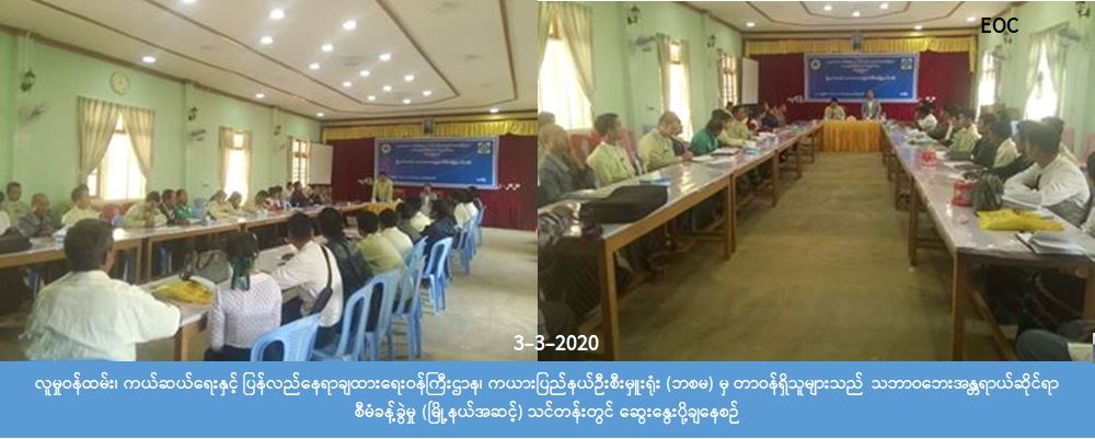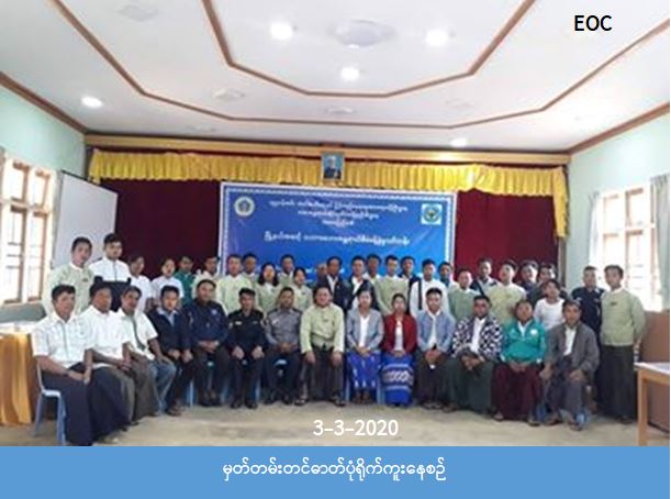 လူမှုဝန်ထမ်း၊ ကယ်ဆယ်ရေးနှင့် ပြန်လည်နေရာချထားရေးဝန်ကြီးဌာန၊ ဘေးအန္တရာယ်ဆိုင်ရာ စီမံခန့်ခွဲမှုဦးစီး ဌာန၊ ကယားပြည်နယ်ဦးစီးမှူးရုံးမှ တာဝန်ရှိသူများသည် သဘာဝဘေးအန္တရာယ်ဆိုင်ရာ စီမံခန့်ခွဲမှု( မြို့နယ် အဆင့်) သင်တန်းအား(၃-၃-၂၀၂၀)ရက်နေ့ (၀၈:၃၀) နာရီ ဖရူဆိုမြို့၊ မြို့နယ်အေထွေထွေ အုပ်ချုပ်ရေးဦးစီး ဌာန အစည်းအဝေခန်းမတွင် သင်တန်းသားဦးရေ (၄၃) ဦးဖြင့် ဖွင့်လှစ်ခဲ့ပြီး သင်တန်းကာလမှာ (၃-၃-၂၀၂၀) ရက်နေ့မှ (၅-၃-၂၀၂၀)ရက်နေ့အထိ (၃) ရက်ကြာ ဖွင့်လှစ်ပို့ချသွားမည်ဖြစ်ကြောင်း သိရှိရပါသည်။
