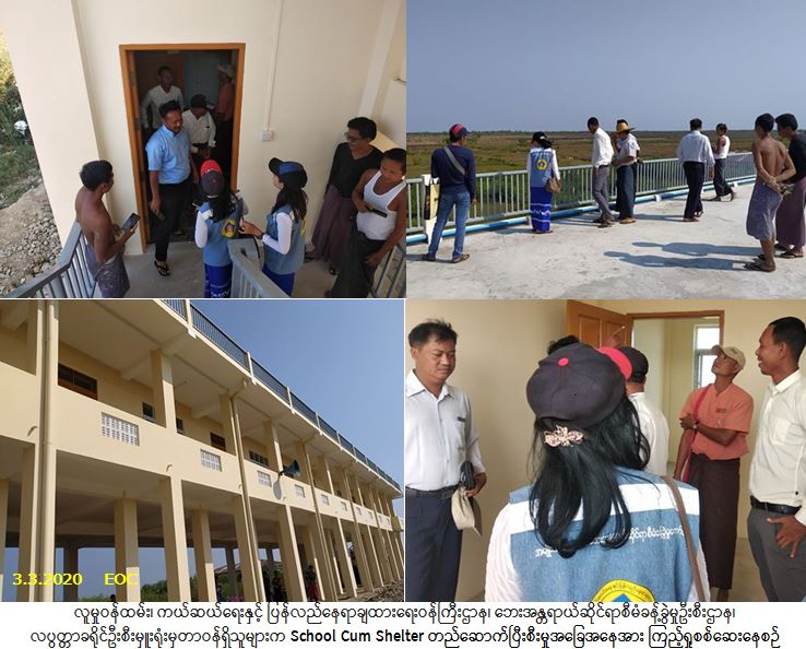 လူမှုဝန်ထမ်း၊ ကယ်ဆယ်ရေးနှင့် ပြန်လည်နေရာချထားရေးဝန်ကြီးဌာန၊ ဘေးအန္တရာယ်ဆိုင်ရာစီမံခန့်ခွဲမှုဦးစီး ဌာန၊ လပွတ္တာခရိုင်ဦးစီးမှူးရုံးမှတာဝန်ရှိသူများသည် မြို့နယ်ဆောက်လုပ်ရေးကြီးကြပ်မှုကော်မတီအဖွဲ့နှင့်အတူ (၃-၃-၂၀၂၀) ရက်နေ့တွင် လပွလပွတ္တာမြို့နယ်၊ ရွေးကျေးရွာအုပ်စု၊ ဂွေးခေျာင်းကျေးရွာ၌ အမျိုးသားသဘာဝဘေးအန္တရာယ်ဆိုင်ရာစီမံခန့်ခွဲမှုကော်မတီ၏ရန်ပုံငွေဖြင့် တည်ဆောက်လျက်ရှိသည့် School Cum Shelter တည်ဆောက်ခြင်းလုပ်ငန်း ရာနှုန်းပြည့်(၁၀၀%) ပြီးစီးမှုအခြေအနေကို သွားရောက်ကြည့်ရှု စစ်ဆေးခဲ့ပါကြောင်း သတင်းရရှိပါသည်။
