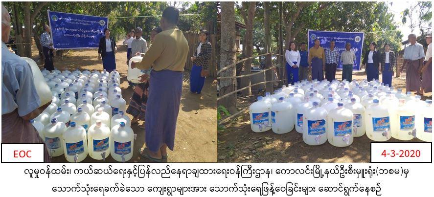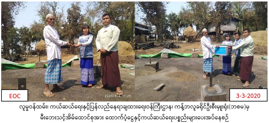 လူမှုဝန်ထမ်း၊ ကယ်ဆယ်ရေးနှင့်ပြန်လည်နေရာချထားရေးဝန်ကြီးဌာန၊ ဘေးအန္တရာယ်ဆိုင်ရာစီမံခန့်ခွဲမှုဦးစီးဌာန၊ ကန့်ဘလူခရိုင်ဦးစီးမှူးရုံးမှ တာဝန်ရှိသူများသည် (၁-၃-၂၀၂၀)ရက်နေ့ (၁၂:၀၀)နာရီအချိန်တွင် မီးဘေးဖြစ်ပွားခဲ့သော ကန့်ဘလူမြို့ နယ်၊ ချဥ်မြစ်ကျဥ်းကျေးရွာအုပ်စု၊ ချဥ်မြစ်ကျဥ်းကျေးရွာရှိ လူနေအိမ်(၁)လုံးမှ အိမ်ထောင်စု(၁)စုအတွက် အိမ်ဆောက်ပစ္စည်းဖိုးထောက်ပံ့ငွေ (၁၀၀၀၀ဝိ/-)ကျပ်၊ မီးဘေးသင့်လူဦးရေ (၅)ဦးအတွက် ဆန်ရိက္ခါဖိုးထောက်ပံ့ငွေ (၁၀၅၀ဝိ/-)ကျပ်၊စုစုပေါင်းထောက်ပံ့ငွေ (၁၁၀၅၀ဝိ/-)ကျပ်နှင့် ကယ်ဆယ်ရေးပစ္စည်း (၁၆)မျိုး (၁)အိမ်ထောင်စာတို့အား (၃-၃-၂၀၂၀)ရက်နေ့ (၁၁:၂၅)နာရီအချိန်တွင် ဘေးသင့်ပြည်သူထံသို့ သွားရောက်ထောက်ပံ့ခဲ့ပြီးဖြစ်ပါကြောင်း သတင်းရရှိပါသည်။