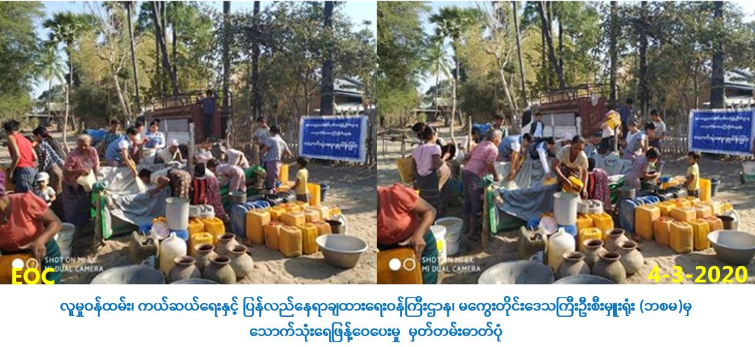 လူမှုဝန်ထမ်း၊ ကယ်ဆယ်ရေးနှင့်ပြန်လည်နေရာချထားရေး၀န်ကြီးဌာန၊ ဘေးအန္တရာယ်ဆိုင်ရာစီမံ ခန့်ခွဲမှုဦးစီးဌာန၊ မကွေးတိုင်းဒေသကြီးဦးစီးမှူးရုံးမှတာဝန်ရှိသူများသည် (၄- ၃-၂၀၂၀) ရက်နေ့၊(၁၁: ၀၀) နာရီအချိန်တွင် သောက်သုံးရေခက်ခဲသော မကွေးမြို့နယ် ၊ ကြာကန်ကျေးရွာအုပ်စု၊ ကြာကန်ကျေးရွာ၊ ဦးဝင်းကြည်(တဲတိုက်)၊ ဦးသောင်းငွေ(တဲတိုက်)နှင့် ဦးကျော်စိန်(တဲတိုက်)ရှိ အိမ်ခြေ (၁၃၇) လုံး၊ အိမ်ထောင်စု (၁၄၃) စု၊ လူဦးရေ (၆၈၉) ဦးတို့အတွက် သောက်သုံးရေဂါလံ (၆၀၀၀) အား သွားရောက်ဖြန့်ဝေပေးခဲ့ပါကြောင်း သတင်းရရှိပါသည်။
