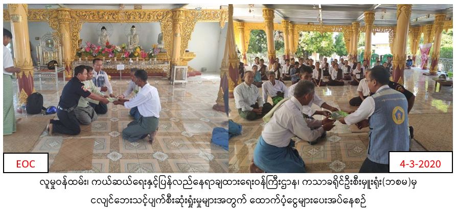 လူမှုဝန်ထမ်း၊ ကယ်ဆယ်ရေးနှင့်ပြန်လည်နေရာချထားရေးဝန်ကြီးဌာန၊ ဘေးအန္တရာယ်ဆိုင်ရာစီမံခန့်ခွဲမှုဦးစီးဌာန၊ ကသာခရိုင်ဦးစီးမှူးရုံးမှ (၄.၃.၂၀၂၀)နေ့တွင် ကသာခရိုင်၊ အင်းတော်မြို့နယ်၊ မော်လူးမြို့အနီးတွင် ငလျင်လှုပ်ခတ်မှုဖြစ်ပွားခဲ့ရာ အင်းတော်မြို့နယ် ပုန်းဟုန်ကျေးရွာအုက်စု၊ ဖုန်ကုန်းကျေးရွာဘုန်းကြီးကျောင်းအတွင်းရှိ ရန်အောင်မင်္ဂလာကျောင်းဆောင်၊ ကျားယောဂီဆောင်၊ မယောဂီဆောင်နှင့် မော်လူးမြို့၊ မင်းသီရိရပ်ကွက် ဒီပင်္ကရာဘုရားဝင်းအတွင်း ဆွမ်းစားဆောင်RC (၂)ထပ်၊ ကျောင်းထိုင်ဘုန်းကြီးကျောင်းRC(၃)ထပ်တို့ ပျက်စီးမှုအတွက် တစ်ဆောင်လျှင်(၇၀၀၀၀ိ/-)နှုန်းဖြင့် စုစုပေါင်း(၅)ဆောင်အတွက် (၃၅၀၀၀၀ိ/-)ကို (၄.၃.၂၀၂၀)ရက်နေ့၊ (၁၅း၄၀)တွင်သွားရောက်ထာက်ပံ့ခဲ့ကြောင်း သတင်းရရှိပါသည်။