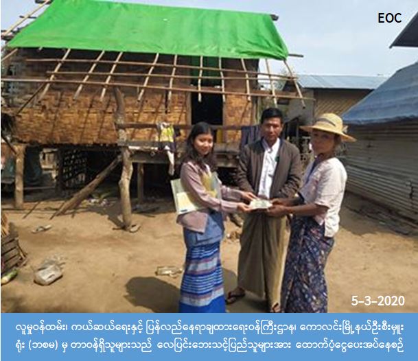လူမှုဝန်ထမ်း၊ ကယ်ဆယ်ရေးနှင့် ပြန်လည်နေရာချထားရေးဝန်ကြီးဌာန၊ ဘေးအန္တရာယ်ဆိုင်ရာ စီမံခန့်ခွဲမှုဉီးစီး ဌာန၊ စစ်ကိုင်းတိုင်းဒေသကြီး၊ ကောလင်းမြို့နယ်ဉီးစီးမှူးရုံးမှ တာဝန်ရှိသူများသည် ဥမှင်ကုန်းကျေးရွာ အုပ်စု၊ ဥမင်ကုန်းကျေးရွာတွင် မိုးသည်းထန်စွာရွာသွန်းပြီး လေပြင်းတိုက်ခတ်မှုကြောင့် သွပ်အချပ်ရေ (၃၀) ချပ် အမိုး လန်သွားသော အိမ်ထောင်စု (၁) စုအတွက် အိမ်ဆောက်ပစ္စည်းဖိုးငွေ (၅၀,၀၀၀) ကျပ်အား (၅-၃-၂၀၂၀) ရက် နေ့တွင် သွားရောက်ထောက်ပံ့ပေးခဲ့ကြောင်း သိရှိရပါသည်။