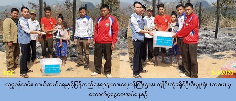 လူမှုဝန်ထမ်း၊ ကယ်ဆယ်ရေးနှင့် ပြန်လည်နေရာချထားရေးဝန်ကြီးဌာန၊ ဘေးအန္တရာယ် ဆိုင်ရာစီမံခန့်ခွဲမှုဦးစီးဌာန၊ ကျိုင်းတုံခရိုင်ဦးစီးမှူးရုံးမှ တာဝန်ရှိသူများသည်(၅-၃-၂၀၂၀) ရက်နေ့၊ (၀၅:၄၅) နာရီအချိန်တွင် ကျိုင်းတုံမြို့နယ်၊ မိုင်ပန်လယ်ကျေးရွာအုပ်စု၊ ရွှေညောင်ပင် ကျေးရွာတွင် ဖြစ်ပွားခဲ့သော မီးဘေး ကြောင့် မီးဘေးသင့် အိမ်ထောင်စု (၂) စုအတွက် ကယ်ဆယ်ရေးပစ္စည်း (၂၂) မျိုး၊ အိမ်ဆောက် ပစ္စည်းဖိုးငွေ (၂၀၀,၀၀၀) နှင့် လူဦးရေ(၉) ဦးအတွက် ဆန်ရိက္ခာ(၇) ရက်စာထောက်ပံ့ငွေ (၁၈,၉၀၀) ကျပ် စုစုပေါင်းငွေ (၂၁၈,၉၀၀) ကျပ် အား(၅ -၃-၂၀၂၀) ရက်နေ့ နေ့လည်(၁၃:၃၀) နာရီအချိန်တွင် ဘေးသင့်ပြည်သူများ လက်၀ယ်အရောက် သွားရောက် ထောက်ပံ့ခဲ့ပါကြောင်း သတင်းရရှိပါသည်။