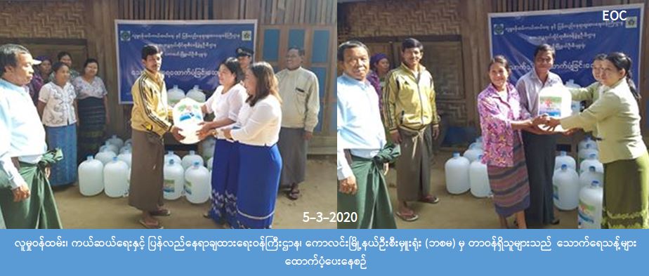 လူမှုဝန်ထမ်း၊ ကယ်ဆယ်ရေးနှင့် ပြန်လည်နေရာချထားရေးဝန်ကြီးဌာန၊ ဘေးအန္တရာယ်ဆိုင်ရာ စီမံ ခန့်ခွဲမှုဦးစီးဌာန၊ စစ်ကိုင်းတိုင်းဒေသကြီး၊ ကောလင်းမြို့နယ်ဦးစီးမှူးရုံးမှ တာဝန်ရှိသူများသည် (၅-၃-၂၀၂၀) ရက်နေ့ (၉:၄၅) အချိန်တွင် ဝန်းသိုမြို့နယ်၊ နမ်းခမ်းကျေးရွာအုပ်စု၊ ဘုံချောင်းကျေးရွာသို့ အိမ်ထောင်စု(၁)စုလျှင် သောက်ရေသန့် (၂၀)လီတာဆံ့ဘူးကြီး (၄)ဘူးစီကို အိမ်ထောင်စု (၇၀)စု၊ လူဦးရေ (၃၂၀)ဦးအတွက် စုစုပေါင်း ရေသန့်ဘူးကြီး (၂၈၀) ဘူးအား ထောက်ပံ့ပေးခဲ့ကြောင်း သိရှိရပါသည်။