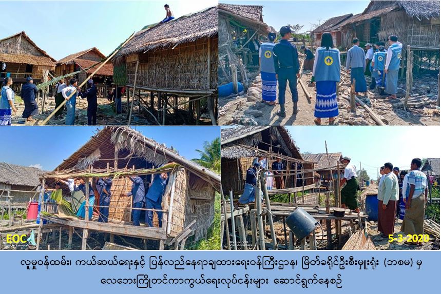 လူမှုဝန်ထမ်း၊ကယ်ဆယ်ရေးနှင့် ပြန်လည်နေရာချထားရေးဝန်ကြီးဌာန၊ ဘေးအန္တရာယ် ဆိုင်ရာစီမံခန့်ခွဲမှုဦးစီးဌာန၊ မြိတ်ခရိုင်ဦးစီးမှူးရုံးမှ တာဝန်ရှိသူများသည် (၅-၃-၂၀၂၀) ရက်နေ့ နေ့လည်(၂:၀၀) နာရီ အချိန်တွင် မကျည်းကုန်းကျေးရွာအုပ်စု၊ နတ်အိမ်ကမ်း ကျေးရွာတွင် လေပြင်းဘေးကြိုတင်ကာကွယ်ရေး၊ နေအိမ်များ အားဖြည့်ပြုပြင်ခြင်းအား ပုလောမြို့နယ် သဘာဝဘေးအန္တရာယ်စီမံခန့်ခွဲမှုအဖွဲ့နှင့် ပူးပေါင်း၍ ဆောင်ရွက်ခဲ့ပါကြောင်း သတင်းရရှိပါသည်။