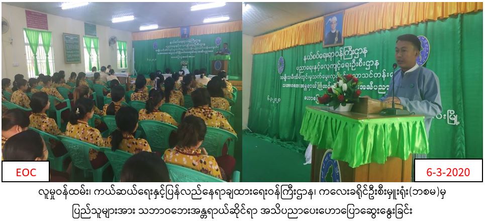 လူမှုဝန်ထမ်း၊ ကယ်ဆယ်ရေးနှင့်ပြန်လည်နေရာချထားရေးဝန်ကြီးဌာန၊ ဘေးအန္တရာယ်ဆိုင်ရာစီမံခန့်ခွဲမှုဦးစီးဌာန၊ ကလေးခရိုင်ဦးစီးမှူးရုံးမှတာဝန်ရှိသူများသည် (၆.၃.၂၀၂၀)ရက်နေ့ (၀၉း၀၀)နာရီအချိန်မှ (၁၁း၀၀)နာရီအချိန်ထိ ကလေးမြို့၊ အမျိုးသမီးအိမ်တွင်းမှု သက်မွေးလုပ်ငန်းပညာသင်တန်းကျောင်းခန်းမတွင် သဘာဝဘေးအန္တရာယ်ကြိုတင်ကာကွယ်ရေး အသိပညာပေးဟောပြောပွဲပြုလုပ်ခဲ့ပါသည်။ အဆိုပါဟောပြောပွဲသို့ ဌာနဆိုင်ရာနှင့် သင်တန်းဆရာမ၊ သင်တန်းသူစုစုပေါင်း(၆၀)ဦးတက်ရောက်ခဲ့ပါကြောင်း သတင်းပေးပို့ရရှိပါသည်။