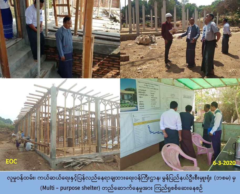 လူမှုဝန်ထမ်း၊ ကယ်ဆယ်ရေးနှင့် ပြန်လည်နေရာချထားရေးဝန်ကြီးဌာန၊ ဘေးအန္တရာယ် ဆိုင်ရာစီမံခန့်ခွဲမှုဦးစီးဌာန၊ မွန်ပြည်နယ်ဦးစီးမှူးရုံးမှ တာဝန်ရှိသူများသည် (၆-၃-၂၀၂၀) ရက်နေ၌ အမျိုးသားသဘာဝဘေးအန္တရာယ်ဆိုင်ရာ စီမံခန့်ခွဲမှုကော်မတီ ခွင့်ပြုရန်ပုံငွေဖြင့် ဘီးလင်းမြို့နယ် ဆရာစံရပ်ကွက်နှင့် ကန်သာယာရပ်ကွက်တို့တွင် (Multi – purpose shelter) (၁) လုံးစီတည်ဆောက်နေမှုနှင့် ဦးစီးဌာန (၂၀၁၉-၂၀၂၀) ဘဏ္ဍာရေးနှစ် ငွေလုံး ငွေရင်းခွင့်ပြုရန်ပုံငွေဖြင့် သထုံခရိုင်ဦးစီးမှူးရုံးဝန်ထမ်းအိမ်ရာ (၃) ခန်းတွဲ (၂) ထပ်တည် ဆောက်နေမှုအား သွားရောက်စစ်ဆေးကြည့်ရှုခဲ့ပါသည်။ ထို့နောက် မွန်ပြည်နယ်ဦးစီးမှူးမှ project တာဝန်ရှိသူများအား သတ်မှတ်ကာလ အတွင်းသတ်မှတ် စံချိန်စံညွှန်းပြည့်မီစွာဖြင့် တည်ဆောက်ရန်မှာကြားခဲ့ပါကြောင်းသတင်းရရှိပါသည်။