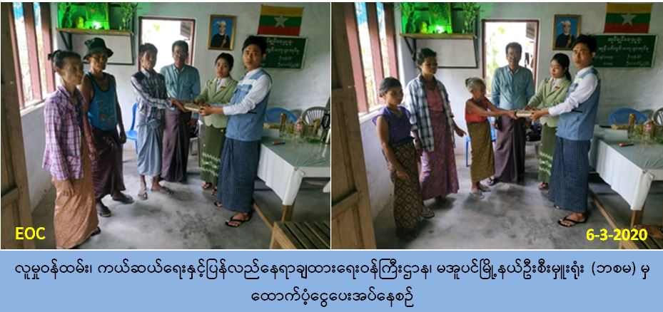 မှုဝန်ထမ်း၊ ကယ်ဆယ်ရေးနှင့် ပြန်လည်နေရာချထားရေးဝန်ကြီးဌာန၊ ဘေးအန္တရာယ် ဆိုင်ရာစီမံခန့်ခွဲမှုဦးစီးဌာန၊ မအူပင်ခရိုင်ဦးစီးမှူးရုံးမှ တာဝန်ရှိသူများသည် မအူပင်ခရိုင်၊ ဓနုဖြူမြို့နယ်၊ အုန်းပင်ကွင်းကျေးရွာအုပ်စု၊ မရမ်းချောင်းကျေးရွာ၌ (၅-၃-၂၀၂၀) ရက်နေ့တွင် ဖြစ်ပွားသော ကမ်းပြိုဘေးကြောင့် ကြိုတင်ရွှေ့ပြောင်းနေအိမ် (၁၁) လုံး အိမ်ထောင်စု (၁၁) စုမှ လူဦးရေ (၄၄) ဦးအတွက် အိမ်ဆောက်ပစ္စည်းဖိုးထောက်ပံ့ငွေ (၁,၁၀၀,ဝဝ၀/-) ကျပ်၊ ဆန်ရိက္ခာ(၇)ရက်စာထောက်ပံ့ငွေ (၉၂,၄၀၀/-)ကျပ်၊ စုစုပေါင်း ထောက်ပံ့ငွေ (၁,၁၉၂,၄၀ဝ-)ကျပ် အား (၆-၃-၂၀၂၀) ရက်နေ့ (၁၆:၀၀)နာရီ အချိန်တွင် ဓနုဖြူမြို့နယ်၊ အထွေထွေအုပ်ချုပ်ရေးဦးစီးဌာနမှ တာဝန်ရှိသူများနှင့်အတူ ကျေးရွာအုပ်ချုပ် ရေးမှူး၊ ရပ်မိ ရပ်ဖများ၏ ရှေ့မှောက်၌ ဘေးသင့်ပြည်သူများ လက်ဝယ်အရောက် ထောက်ပံ့ ပေးအပ် ခဲ့ပါကြောင်းသတင်းရရှိပါသည်။
