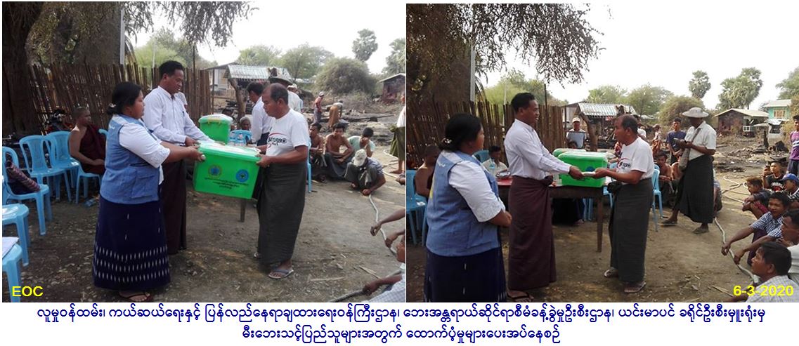 လူမှုဝန်ထမ်း၊ ကယ်ဆယ်ရေးနှင့် ပြန်လည်နေရာချထားရေးဝန်ကြီးဌာန၊ ဘေးအန္တရာယ်ဆိုင်ရာစီမံခန့်ခွဲမှုဦးစီးဌာန၊ ယင်းမာပင် ခရိုင်ဦးစီးမှူးရုံးမှ တာဝန်ရှိသူများသည် ဆားလင်းကြီးလွှတ်တော်ကိုယ်စားလှယ် ဦးစောမောင်နှင့်အတူ ယင်းမာပင်ခရိုင်၊ ဆားလင်းကြီးမြို့နယ်၊ ခွန်သာကျေးရွာအုပ်စု၊ ခွန်သာကျေးရွာတွင် (၅-၃-၂၀၂၀) ရက်နေ့ (၁၁:၃၀) နာရီအချိန်၌ မီးလောင်ကျွမ်းမှု ဖြစ်ပွားခဲ့ရာ မီးဘေးသင့် အိမ်ခြေ (၂) လုံးအတွက် အိမ်ဆောက်ပစ္စည်းဖိုးထောက်ပံ့ငွေ (၄၀၀,၀၀၀/-) ကျပ်၊ လူ(၂၂) ဦးအတွက် ဆန်ဖိုးထောက်ပံ့ငွေ (၄၆,၂၀၀/-)ကျပ်၊ ကယ်ဆယ်ရေးပစ္စည်း (၁၇) မျိုး၊ နှစ်အိမ်ထောင်စာတို့ကို (၆-၃-၂၀၂၀) ရက်နေ့ (၁၅:၀၀) နာရီအချိန်တွင် မီးဘေးသင့်ပြည်သူများ လက်ဝယ်သို့အရောက် ထောက်ပံ့ခဲ့ပါကြောင်း သတင်းရရှိပါသည်။