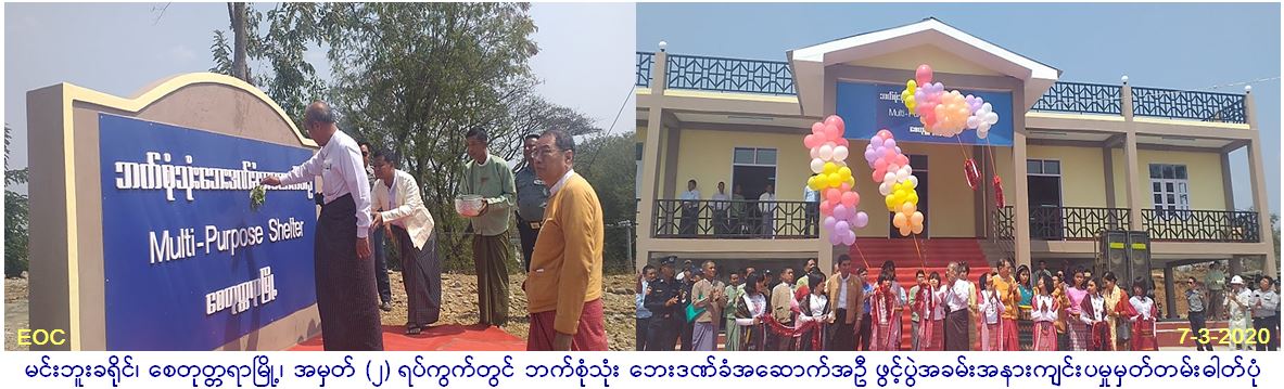 လူမှုဝန်ထမ်း၊ ကယ်ဆယ်နှင့် ပြန်လည်နေရာချထားရေးဝန်ကြီးဌာန၊ ဘေးအန္တရာယ်ဆိုင်ရာစီမံခန့်ခွဲမှုဦးစီးဌာန၊ အမျိုးသား သဘာဝ ဘေးအန္တရာယ်ဆိုင်ရာစီမံခန့်ခွဲမှုကော်မတီ၏ ရန်ပုံငွေဖြင့် မြင့်မိုရ်စံထားကုမ္ပဏီမှ မင်းဘူးခရိုင်၊ စေတုတ္တရာမြို့၊ အမှတ် (၂) ရပ်ကွက်တွင် တာဝန်ယူတည်ဆောက်လျက်ရှိသည့် ဘက်စုံသုံးဘေးဒဏ်ခံအဆောက်အဦဖွင့်ပွဲအခမ်းအနားအား (၇-၃-၂၀၂၀) ရက်နေ့၊ (၁၃:၀၀)နာရီအချိန်၌ ဖွင့်လှစ်ကျင်းပခဲ့ရာ အဆိုပါ အခမ်းအနားသို့ တိုင်းဒေသကြီးဝန်ကြီးချုပ် ဒေါက်တာအောင်မိုးညို၊ တိုင်းဒေသကြီးအစိုးရအဖွဲ့ဝန်ကြီးများ၊ တိုင်းဒေသကြီးလွှတ်တော်ဥက္ကဋ္ဌ၊ တိုင်းဒေသကြီးလွှတ်တော်ကိုယ်စား လှယ်များ၊ မင်းဘူးခရိုင်အထွေထွေအုပ်ချုပ်ရေးမှူး၊ ဘေးအန္တရာယ်ဆိုင်ရာစီမံခန့်ခွဲမှုဦးစီးဌာန၊ မင်းဘူးခရိုင်ဦးစီးမှူးရုံးမှ တာဝန်ရှိသူများ၊ မြို့နယ်အဆင့် ဌာနဆိုင်ရာများ၊ မြင့်မိုရ်စံထားကုမ္ပဏီမှ တာဝန်ရှိသူများ၊ ဒေသခံပြည်သူများနှင့် လူမှုရေး အသင်းအဖွဲ့များ တက်ရောက်ခဲ့ပါကြောင်း သတင်းရရှိပါသည်။