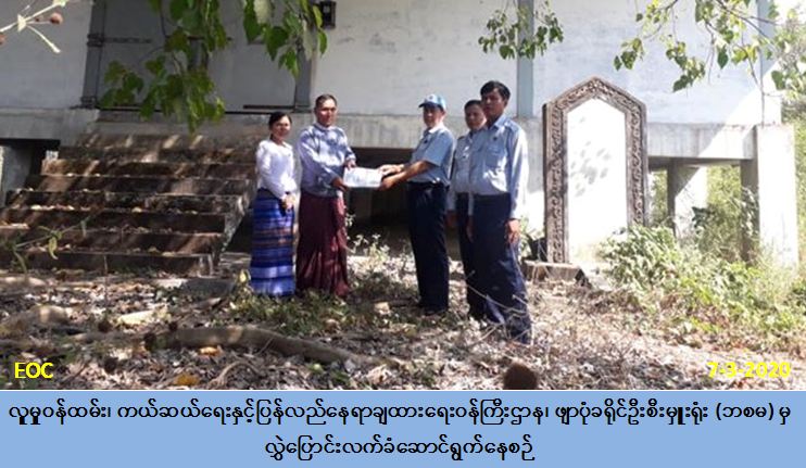 လူမှုဝန်ထမ်း၊ ကယ်ဆယ်ရေးနှင့်ပြန်လည်နေရာချထားရေးဝန်ကြီးဌာန၊ ဘေးအန္တရာယ် ဆိုင်ရာစီမံခန့်ခွဲမှုဦးစီးဌာန၊ ဖျာပုံခရိုင်ဦးစီးမှူးရုံးမှ တာဝန်ရှိသူများသည်(၄-၃-၂၀၂၀) ရက်နေ့တွင် ကျိုက်လတ်မြို့နယ်၊ (၆)ရပ်ကွက်၊ လေးလုံးသိုဝင်း၊ မြေကွက် အမှတ် (၅၂A/N) ၌ရှိသော စားသုံးသူရေးရာစီးဌာနပိုင် မှ Food Security Shelter (၁)လုံးအား လွှဲပြောင်း လက်ခံဆောင်ရွက်ခဲ့ပါကြောင်း သတင်းရရှိပါသည်။